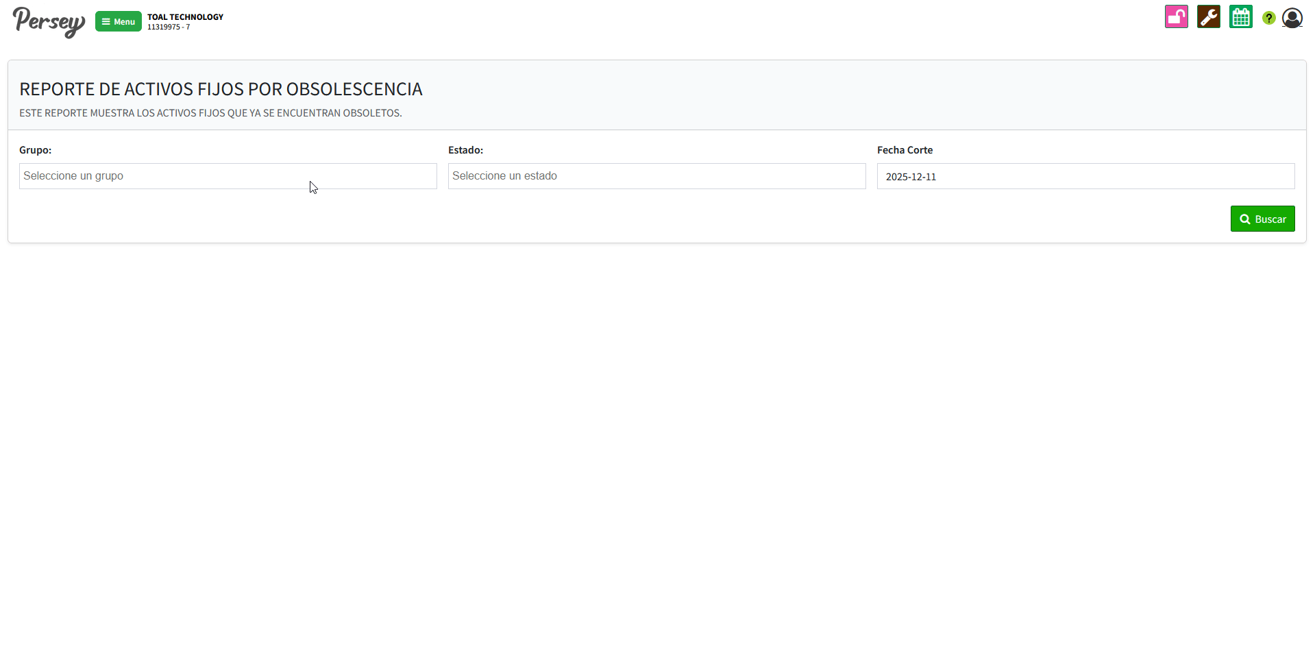 Dirijase hacia la sección de "Reportes" y elija la opción de "Activos Por Obsolescencia". elija el grupo, estado del activo y por ultimo las fechas sobre las cuales quiere usted ver el reporte y posterior a ello oprima en "Buscar"