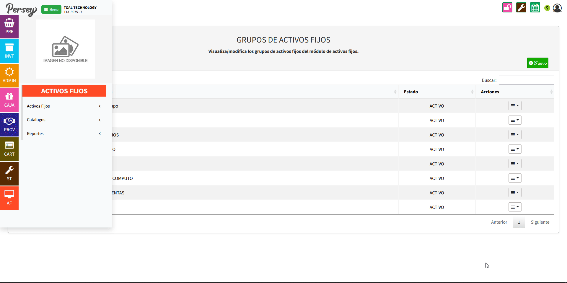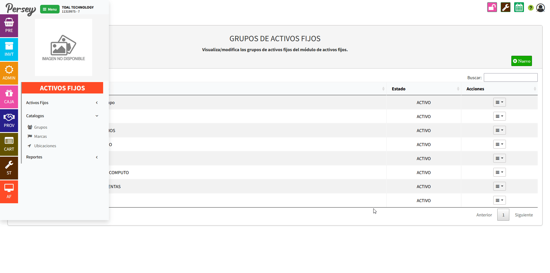 Dirijase hacia la sección de "Catalagos" y elija la opción de "Tecnicos". Allí podrá ver la lista de grupos creados, podrá crear uno nuevo dando click en "Nuevo" o editar uno ya existente dando click en "Editar"