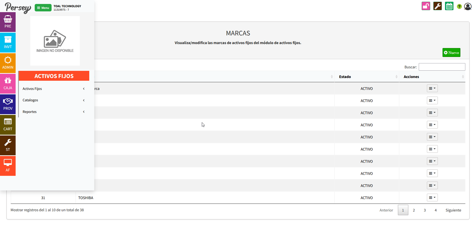 Dirijase hacia la sección de "Catalagos" y elija la opción de "Marcas". Allí podrá ver la lista de los diferentes equipos creados, podrá crear uno nuevo dando click en "Nuevo" o editar uno ya existente dando click en "Editar"