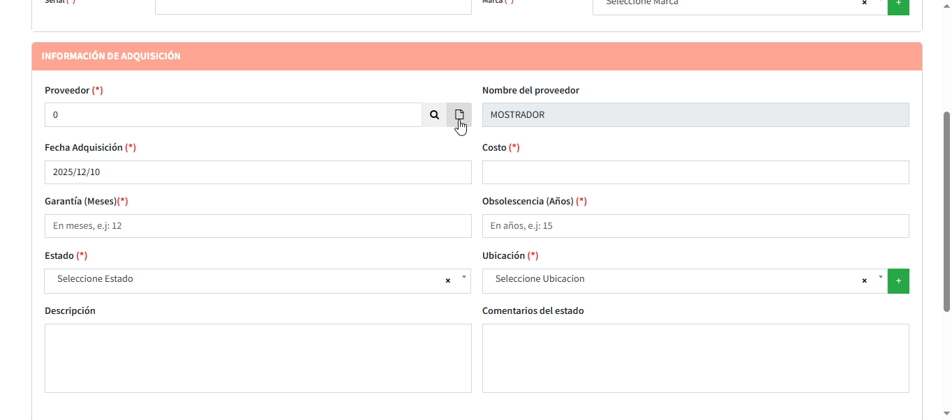 Conitnuaremos con toda la informacion de Informacion De Adquisición seleccionamos nuestro proveedor