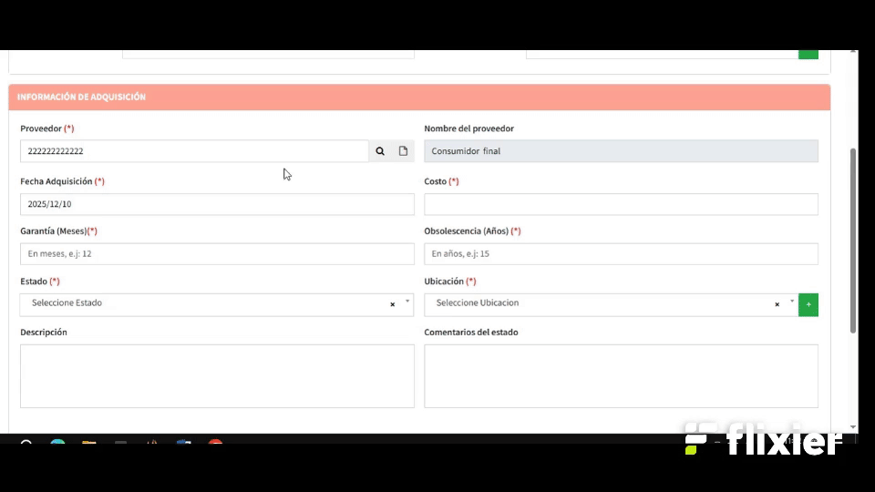 Lo primero que haremos es rellenar los campos de "Informacion General Del activo", así como se muestra en el siguiente video: