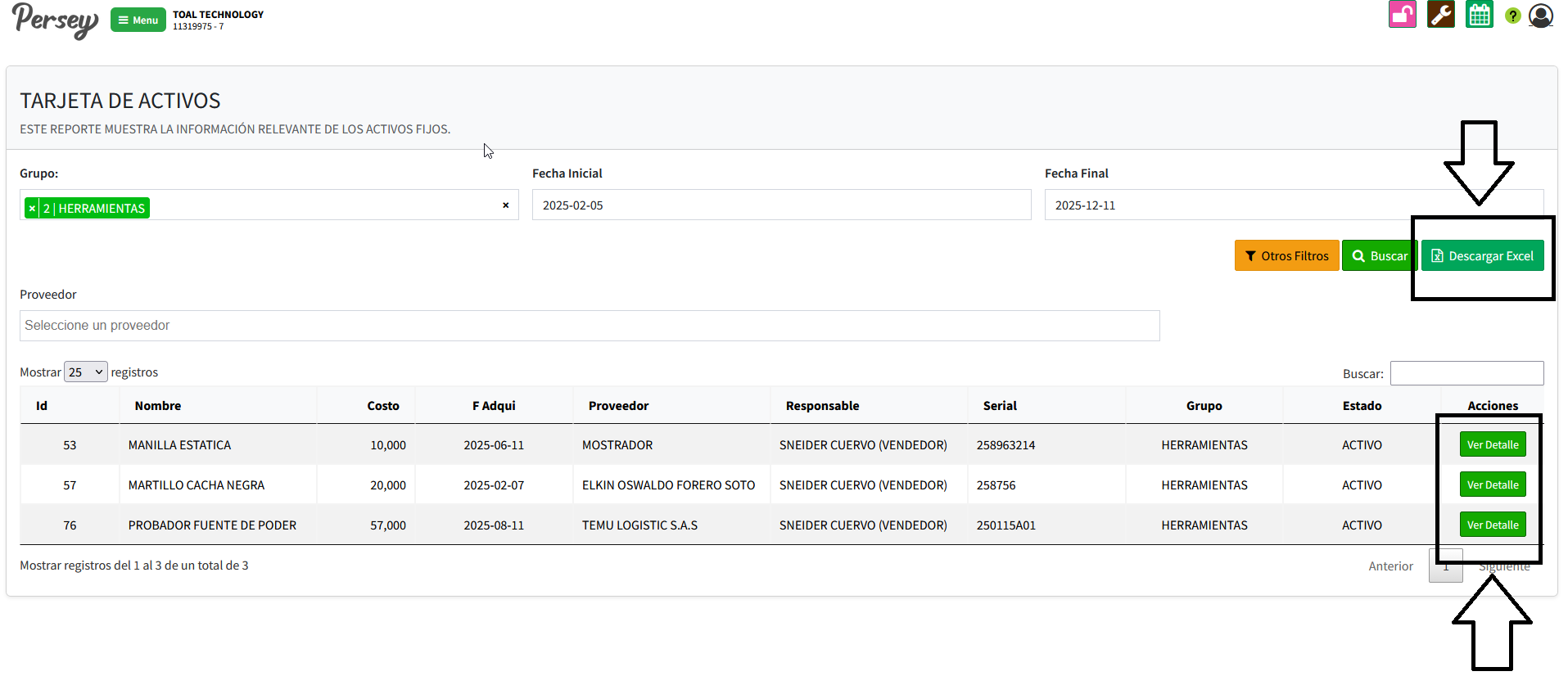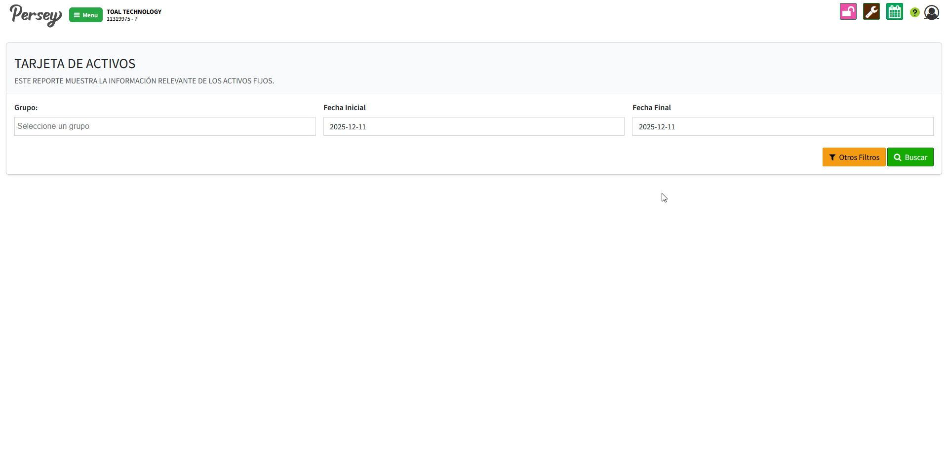 Dirijase hacia la sección de "Reportes" y elija la opción de "Activos Por Responsable". elija el responsable del activo y las fechas sobre las cuales quiere usted ver el reporte y posterior a ello oprima en "Buscar"