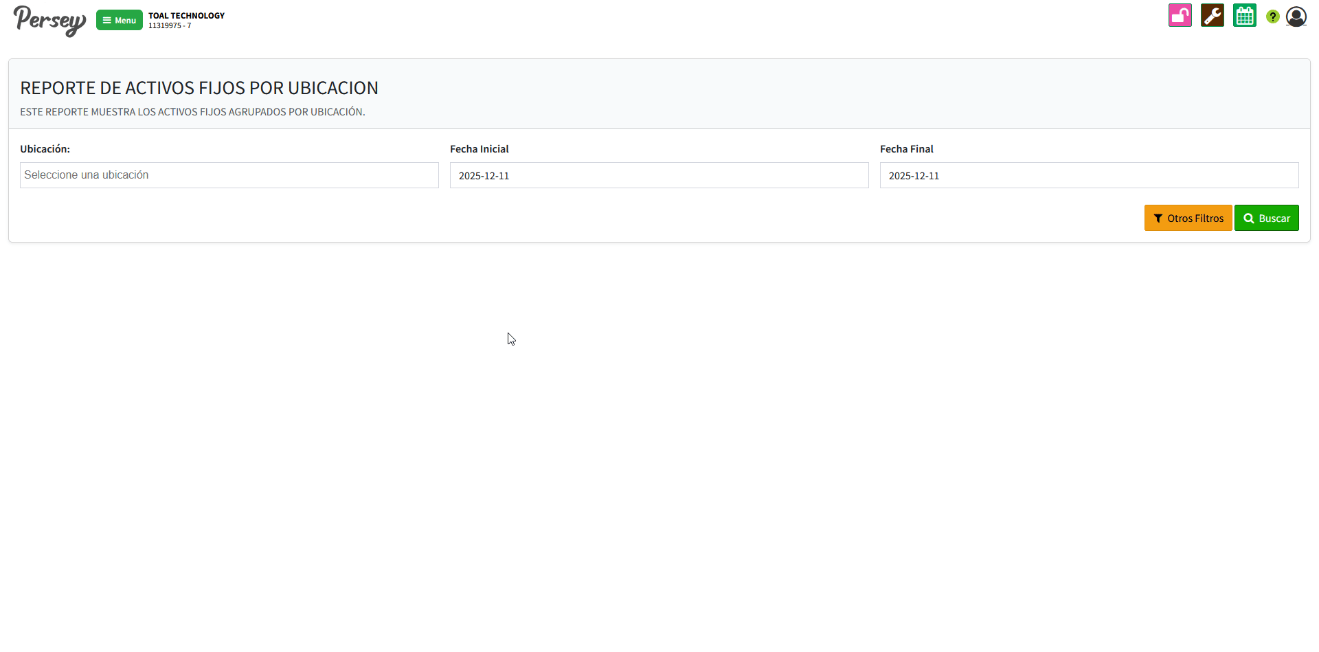 Dirijase hacia la sección de "Reportes" y elija la opción de "Activos Por Ubicacion". elija la ubicacion del activo y las fechas sobre las cuales quiere usted ver el reporte y posterior a ello oprima en "Buscar"