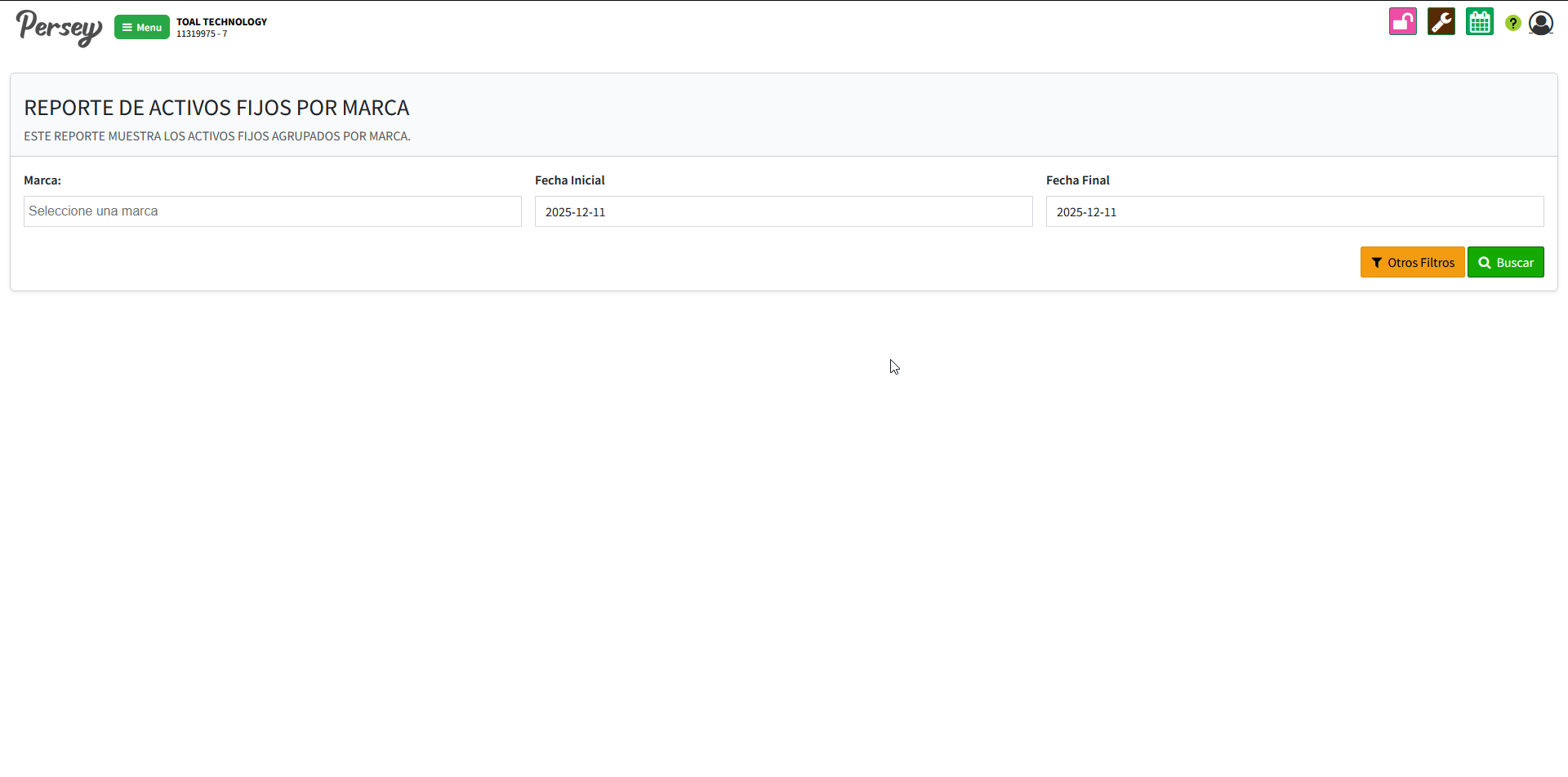 Dirijase hacia la sección de "Reportes" y elija la opción de "Activos Por Marca". elija una o mas marcas y las fechas sobre las cuales quiere usted ver el reporte y posterior a ello oprima en "Buscar"