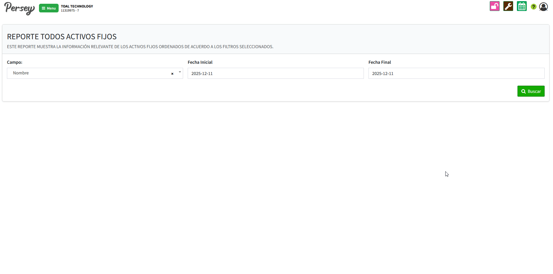 Dirijase hacia la sección de "Reportes" y elija la opción de "todos". seleccione el campo y las fechas sobre las cuales quiere usted ver el reporte y posterior a ello oprima en "Buscar" este reporte nos mostrara todos los activos fijos creados en el sistema y los podremos imprimir en excel o pdf