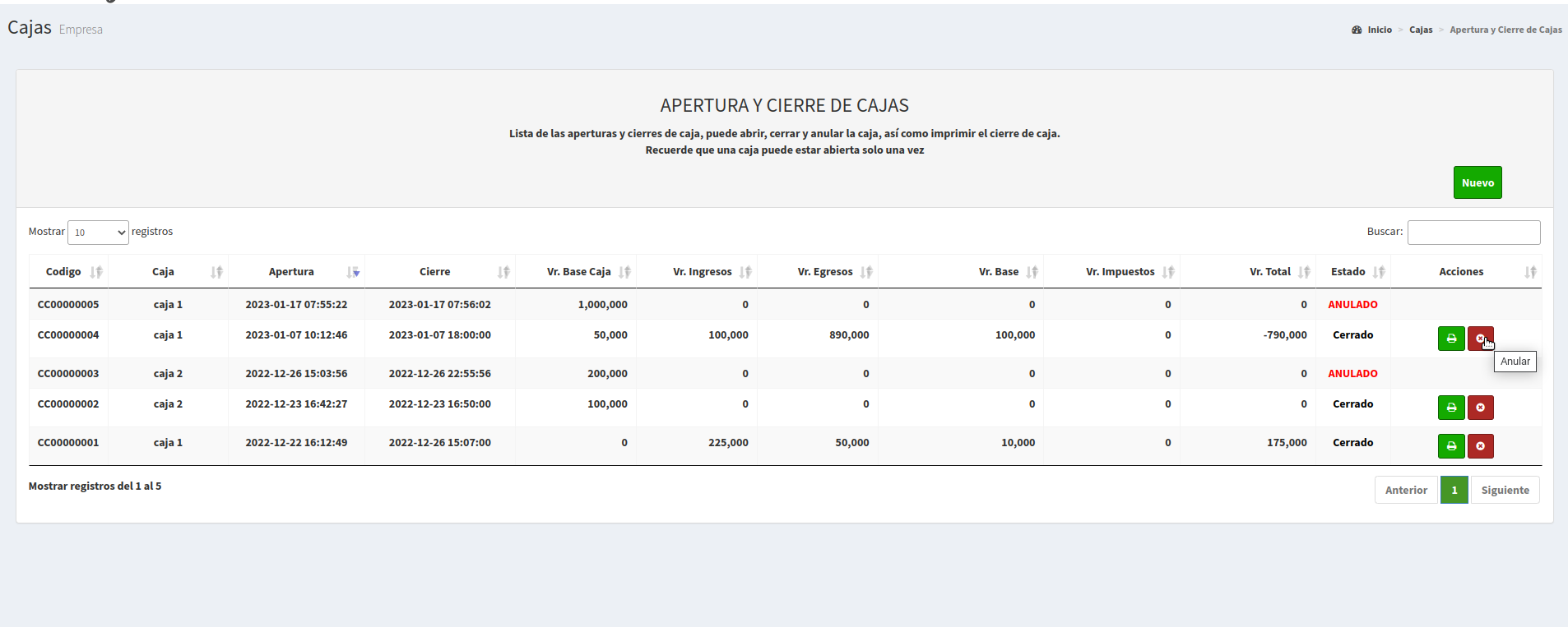 Es trascendental que entienda que si desea anular una caja nueva, en caso de que tenga un error en alguna de ellas, lo puede hacer en la sección de "Apertura y Cierre de Cajas" dando al botón de "Anular" como lo muestra la siguiente imagen: