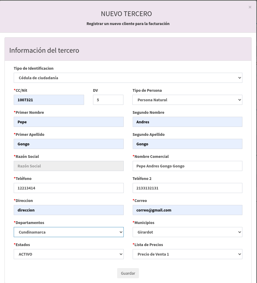 Para agregar un tercero a su empresa debe darle en el boton que dice "NUEVO". Debe diligenciar el formulario con los campos correspondientes de izquierda a derecha, los campos que tienen un asterisco rojo son obligatorios. Cuando complete el formualario debe darle click en el boton que dice "GUARDAR"