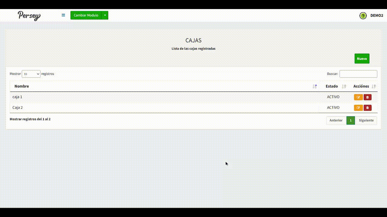 Se debe proceder a escribir el nombre de la caja, posterior a ello, asignele un estado y proceda a "Guardar" como se muestra en el video.