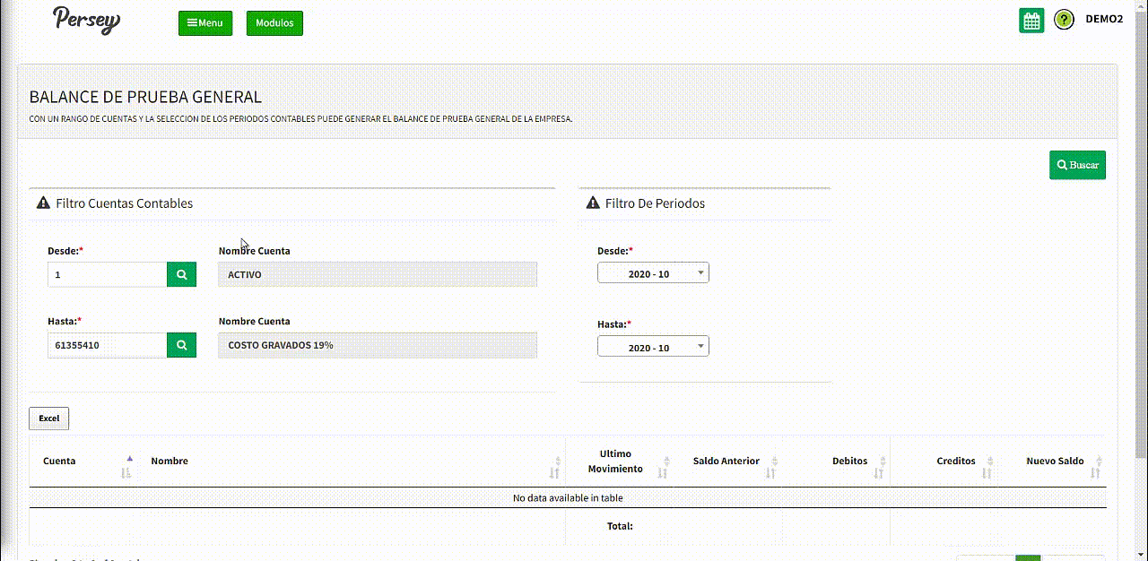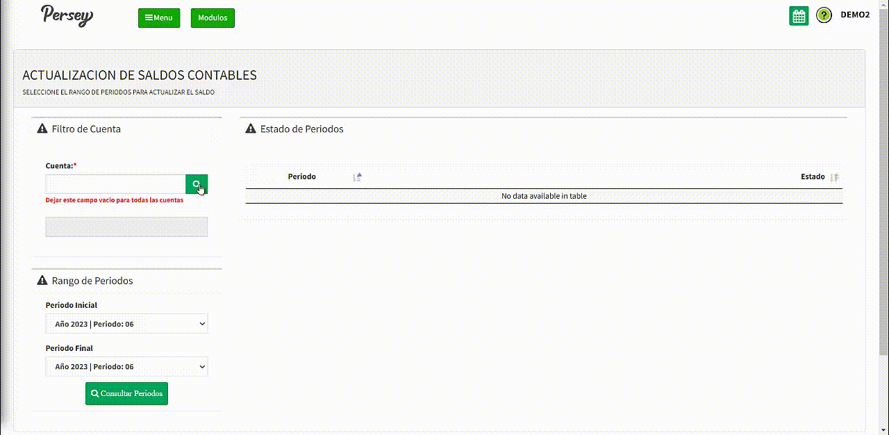 En este apartado debera seleccionar la cuenta de la cual desea actualizar los saldos. A su vez cuenta con un filro para establecer el rango de periodos.