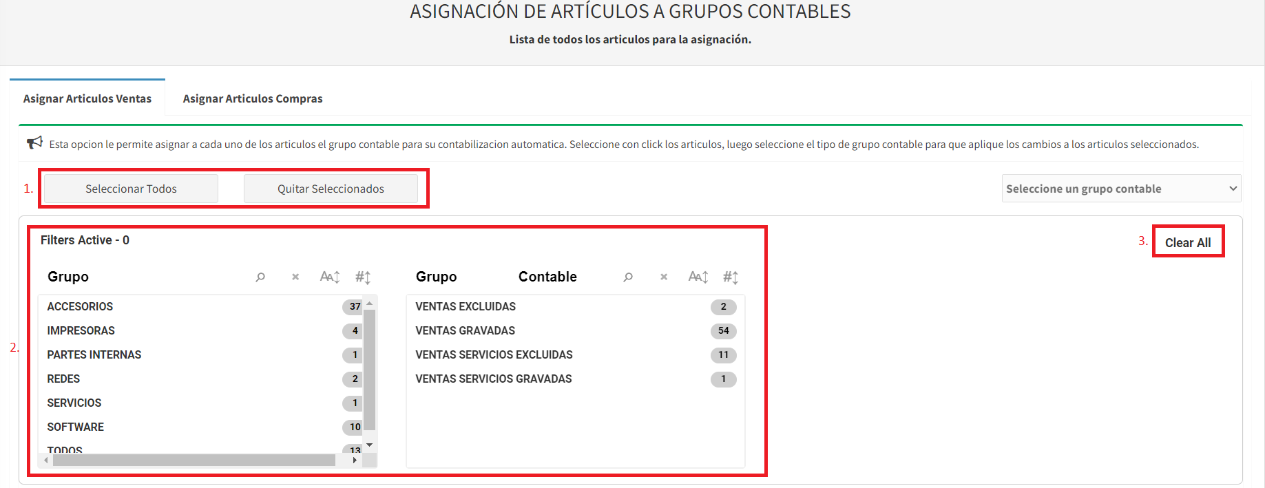 Este apartado cuenta con diversas opciones como lo son 1. Seleccionar todos los elementos o quitar su seleccion, 2. Filtros para facilitar la busqueda y 3. Un boton para limpiar todos los filtros.