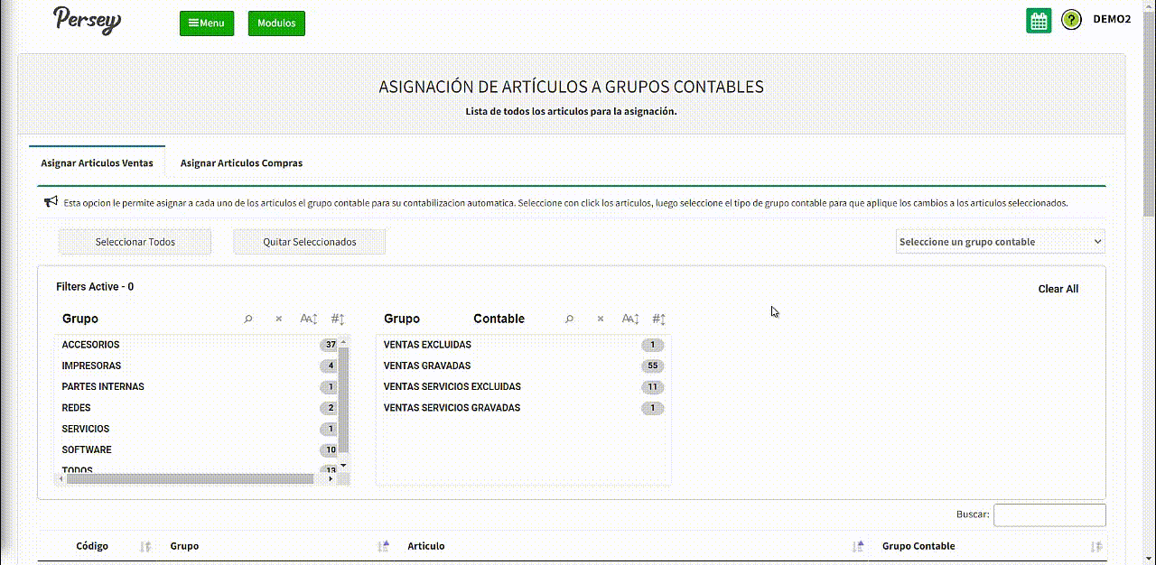 Esta opcion le permite asignar a cada uno de los articulos el grupo contable para su contabilizacion automatica.