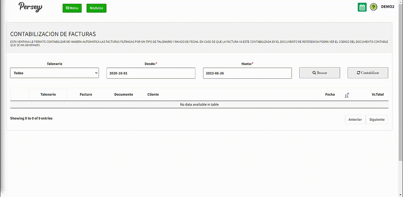 Esta ventana le permite contabilizar de manera automática las facturas filtradas por un tipo de talonario y rango de fecha. En caso de que la factura ya