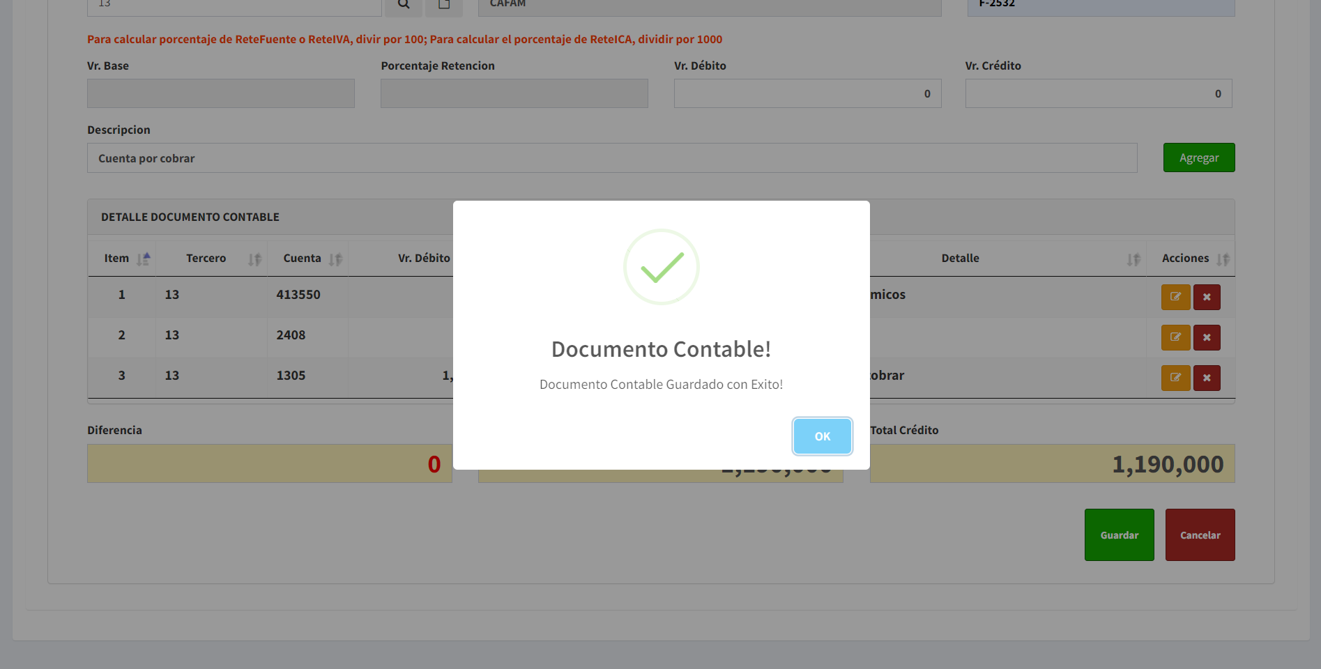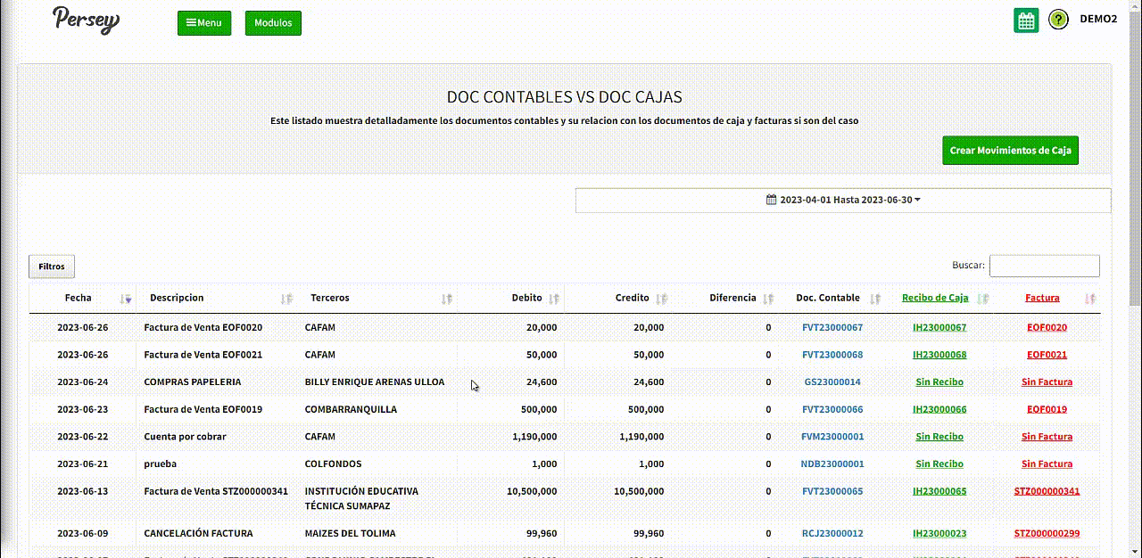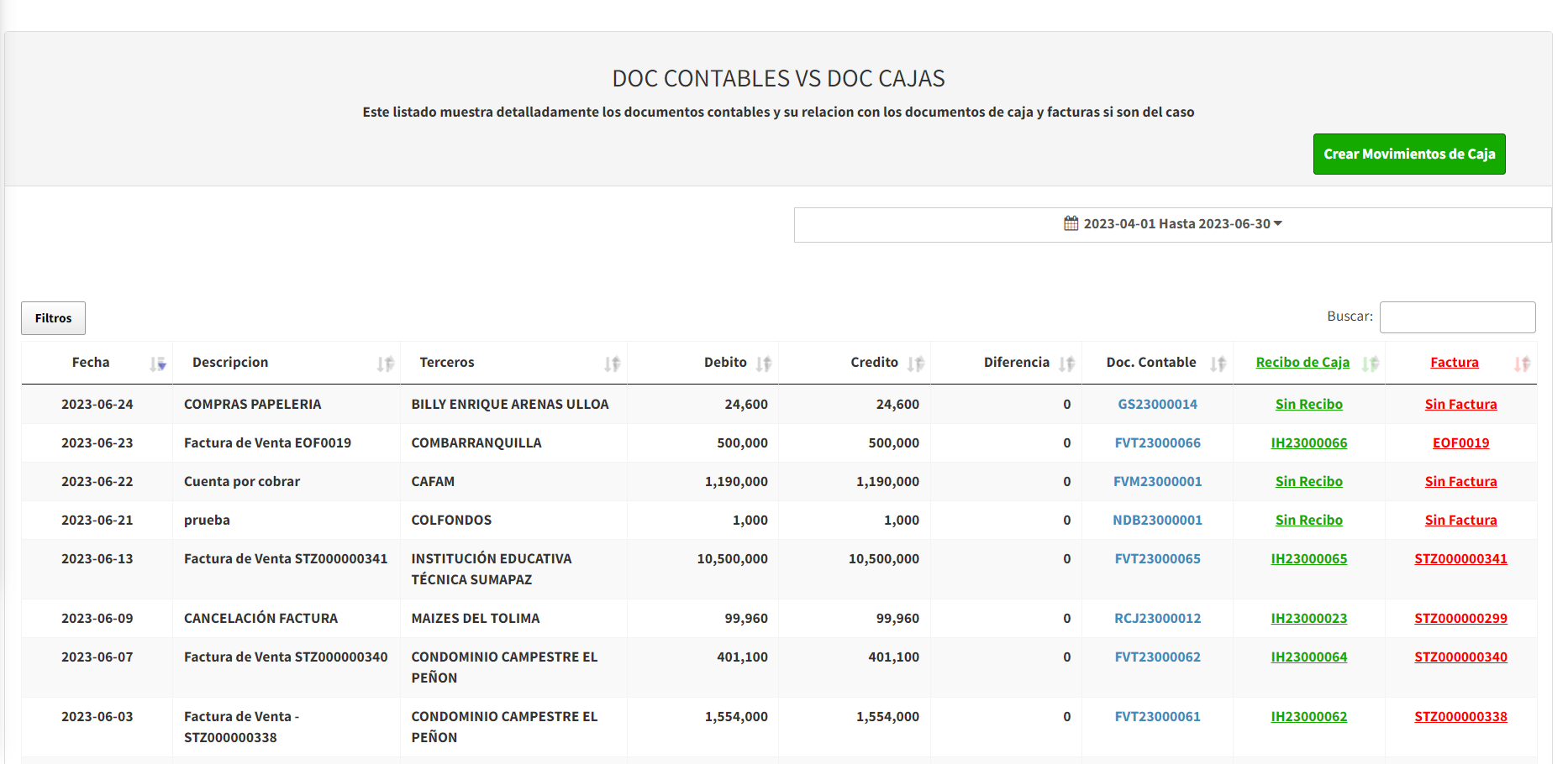 Nota: En dado caso de que no le se haya generado automaticamente el movimiento de caja podra hacerlo de forma manual seleccionando el documento contable y dando click en crear movimiento de caja.