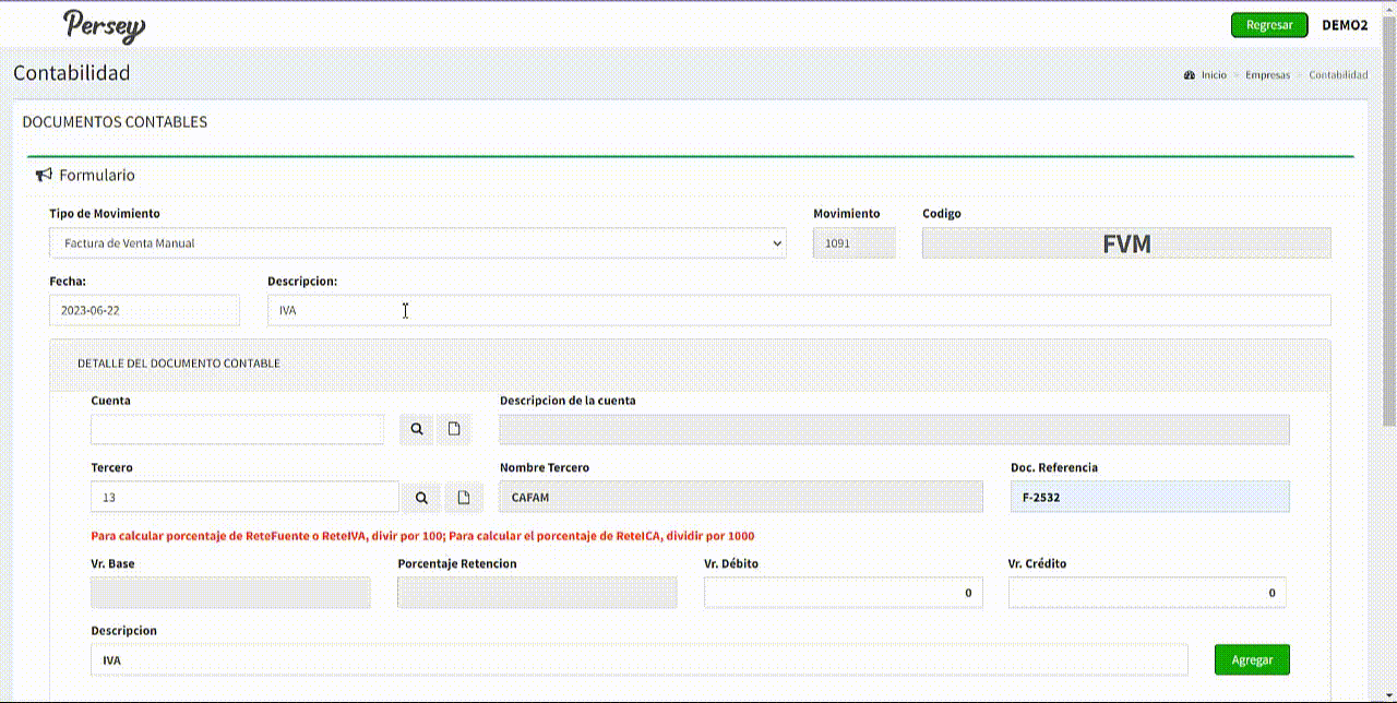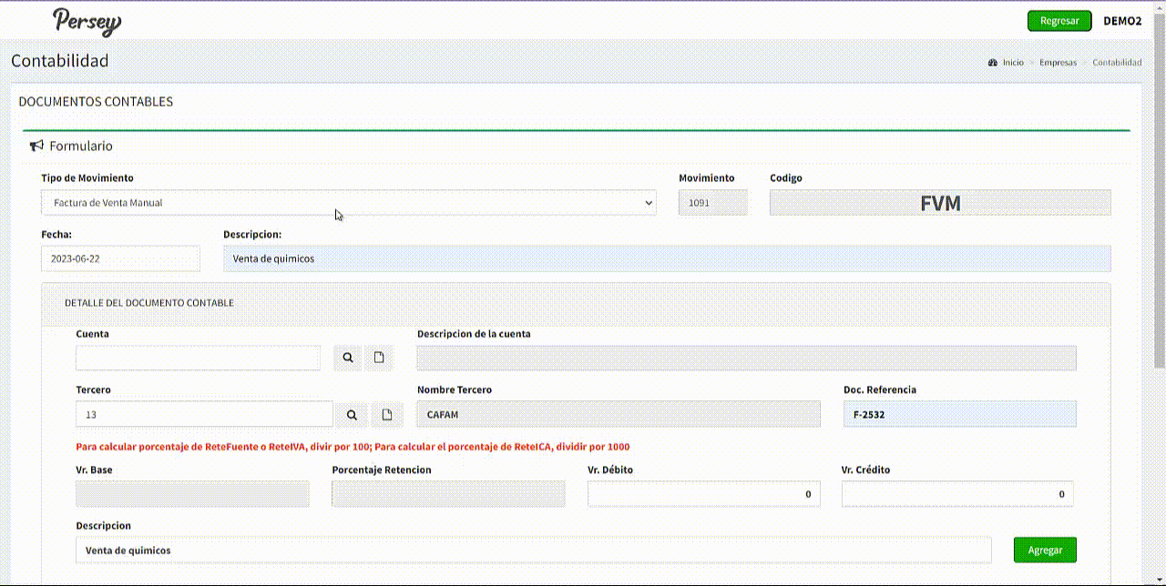 Para el ejemplo visual se realizo una venta (credito) la cual sera cobrada al tercero y este debera pagarla (debito)