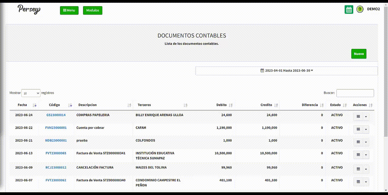 Una vez realizado todo el paso 2, el documento contable quedara listado y para buscarlos se puede hacer de forma manual buscando de pagina en pagina o ingresando
