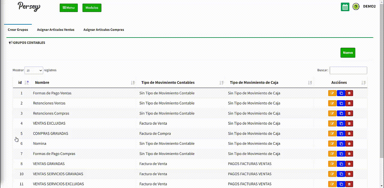 Dirijase hacia la sección de Parametros y elija la opción de Grupos Contables. Alli vera en la parte superior izquierda un boton que dice NUEVO al cual debera darle click para ingresar y crear un nuevo grupo contable.