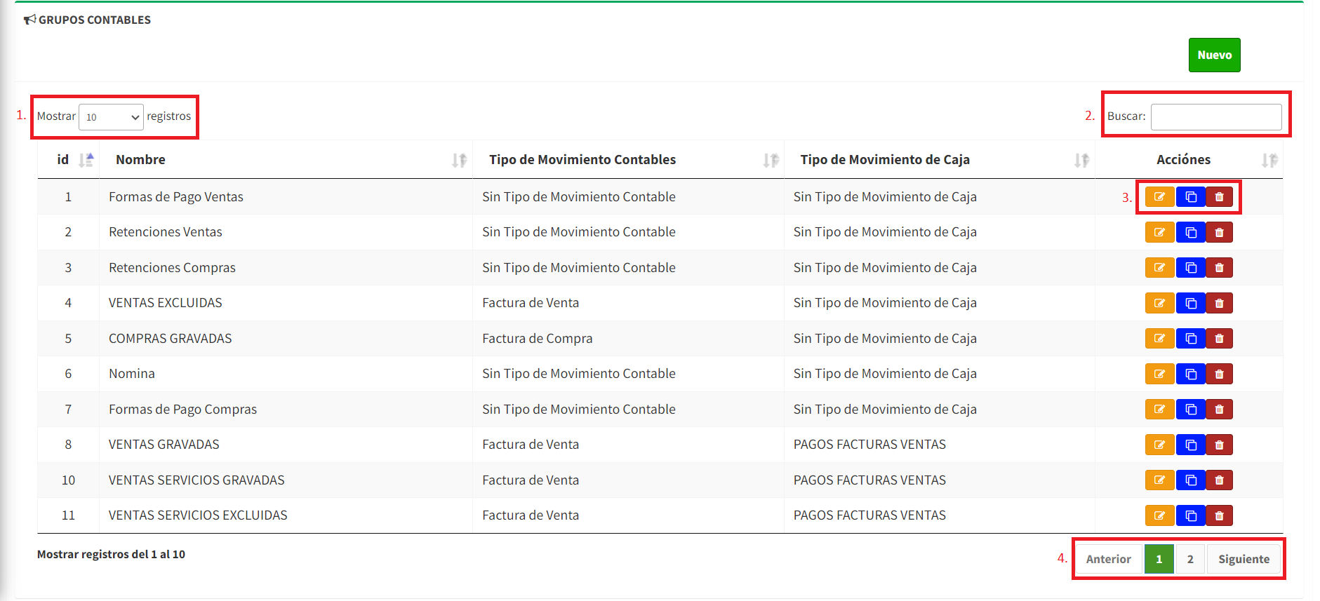 ingresando un valor en caracteristico en la barra de buscar, 3. Editar, copiar o eliminar un registro y 4. Desplazarse entre paginas.
