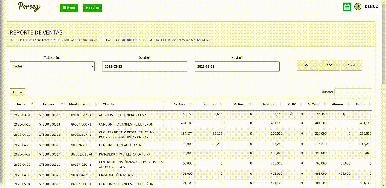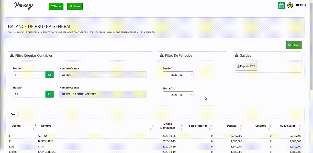 Nota: No olvide que usted puede ver en PDF o en un documento EXCEL los reportes.