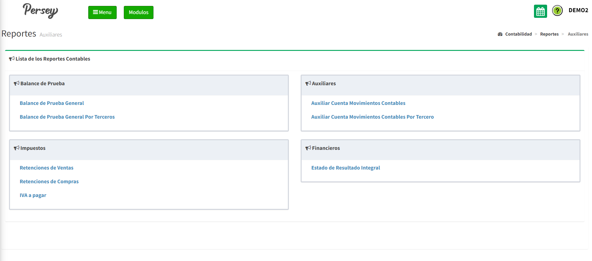 Dirijase en el menú a la opcion de Reportes, luego la opcion Contables