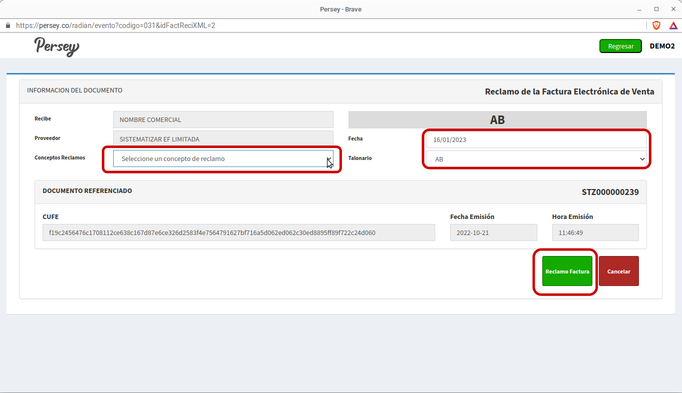 Si por alguna razón se quiere hacer un "Reclamo de Factura" lo puede hacer de la siguiente forma: