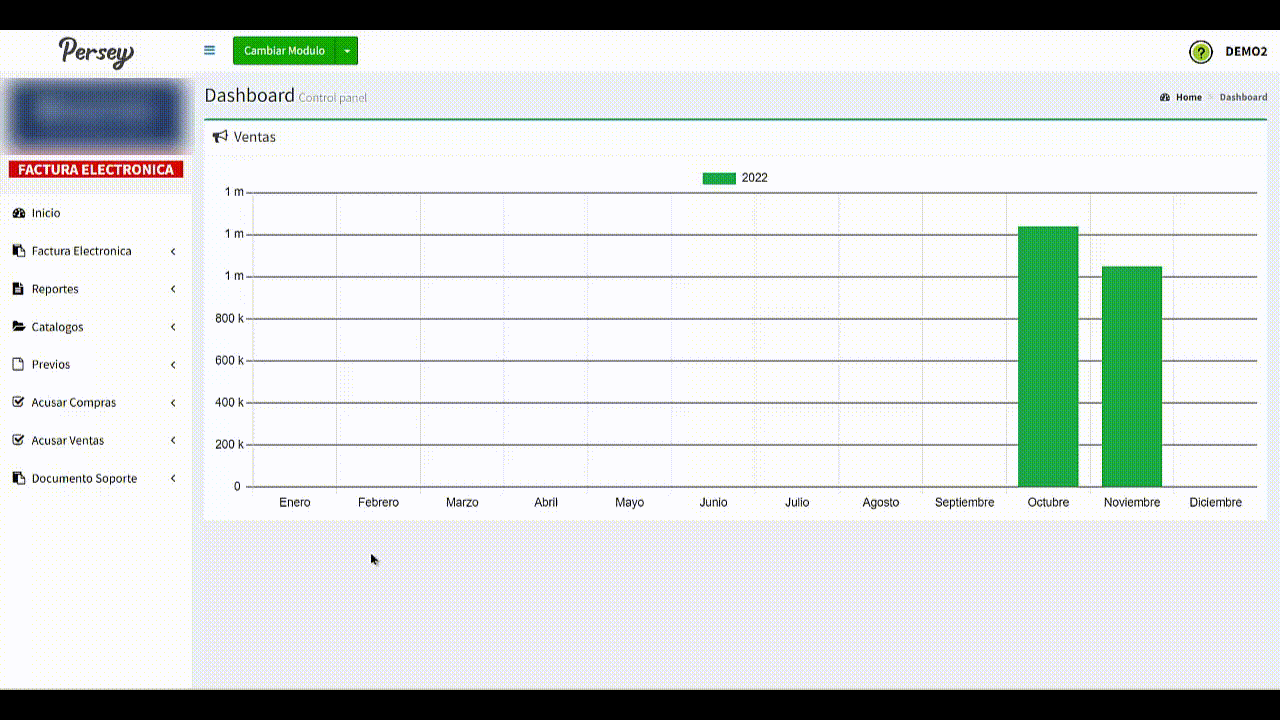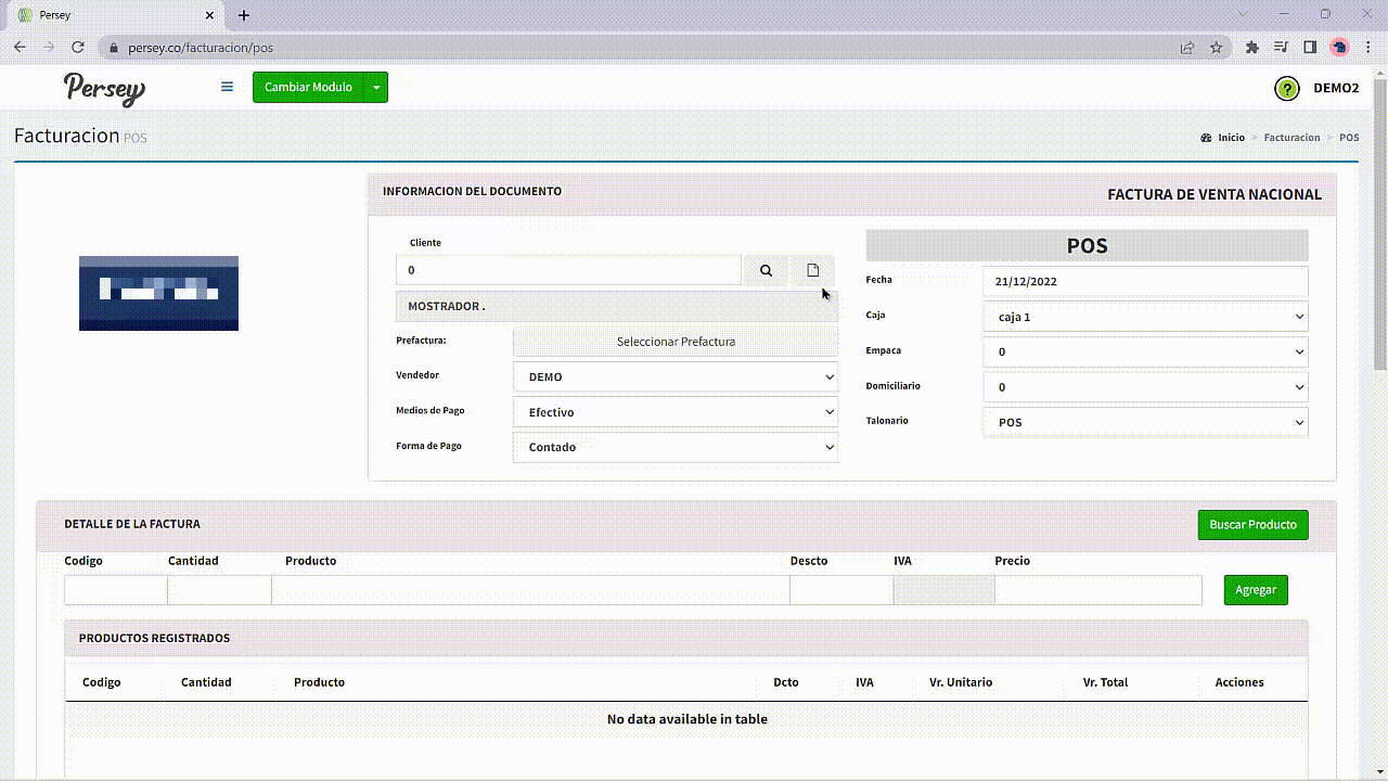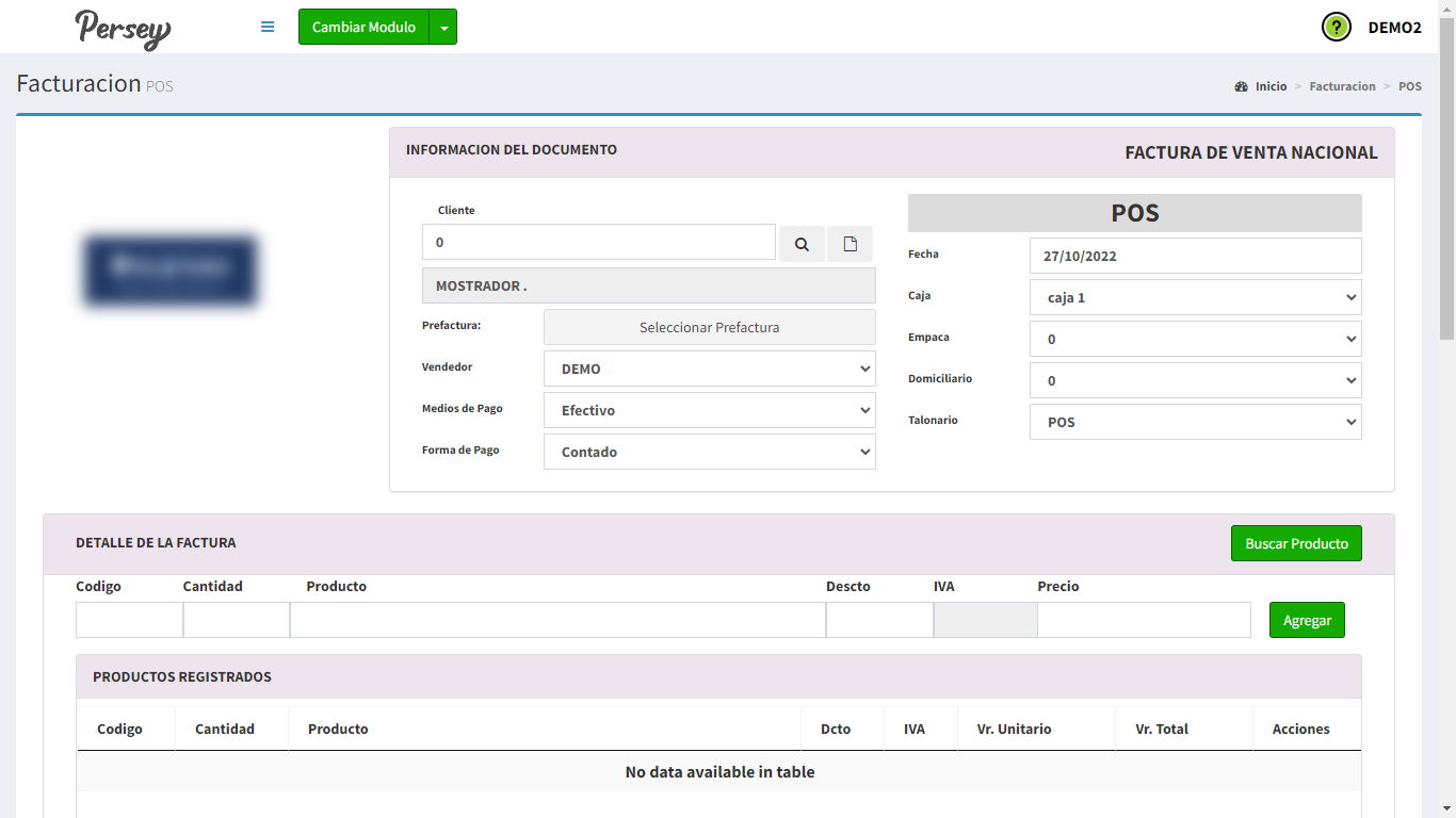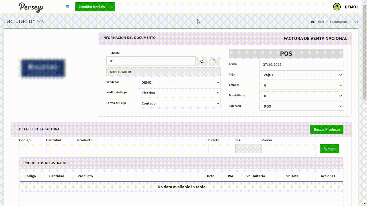 En el menú lateral izquierdo se encontrará con todas las opciones que se podrán realizar en el modulo de Facturacion POS en el aplicativo de Persey.