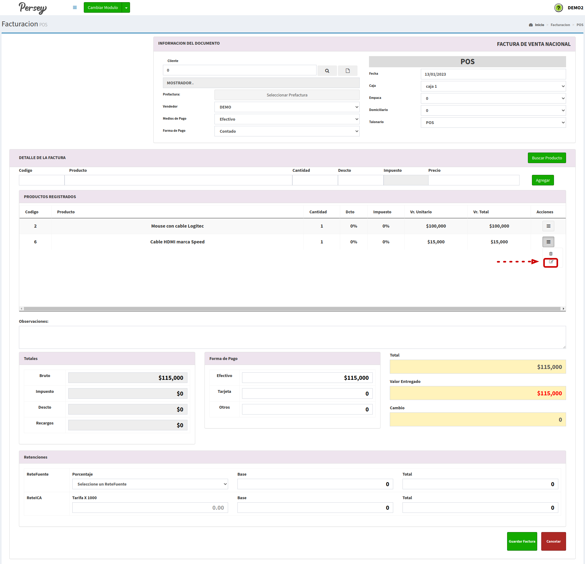 Hay que tener en cuenta que el producto se direccioná hacia la sección "detalle de factura", por lo tanto, cuando se edite el producto, se debe dar al botón "Agregar" nuevamente y cuando este completamente seguro de los cambios, se debe dar en "Guardar Factura".