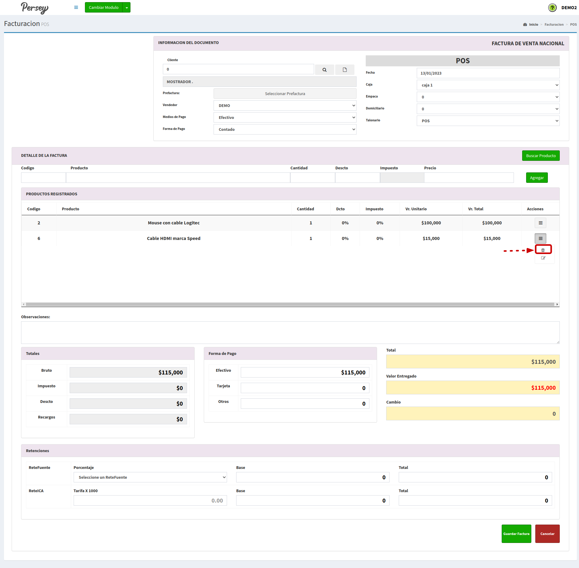 NOTA: El anterior proceso funciona si se cargo una prefactura o si se está diligenciando una factura manualmente.Para eliminar un producto se debe seleccionar la opción de eliminar que corresponde al producto de interes