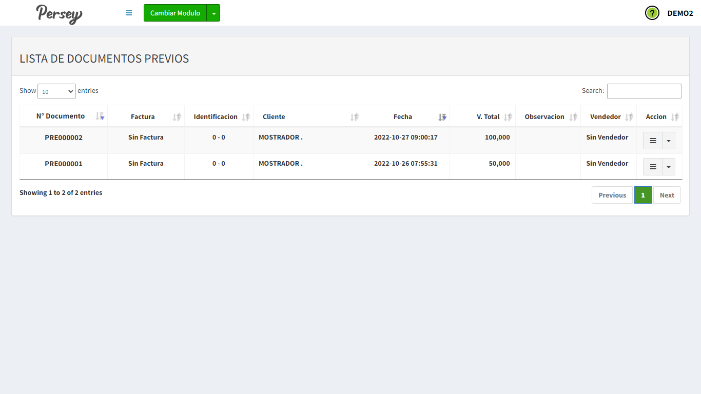 Aqui le apareceran todos los previos o prefacturas que haya generado