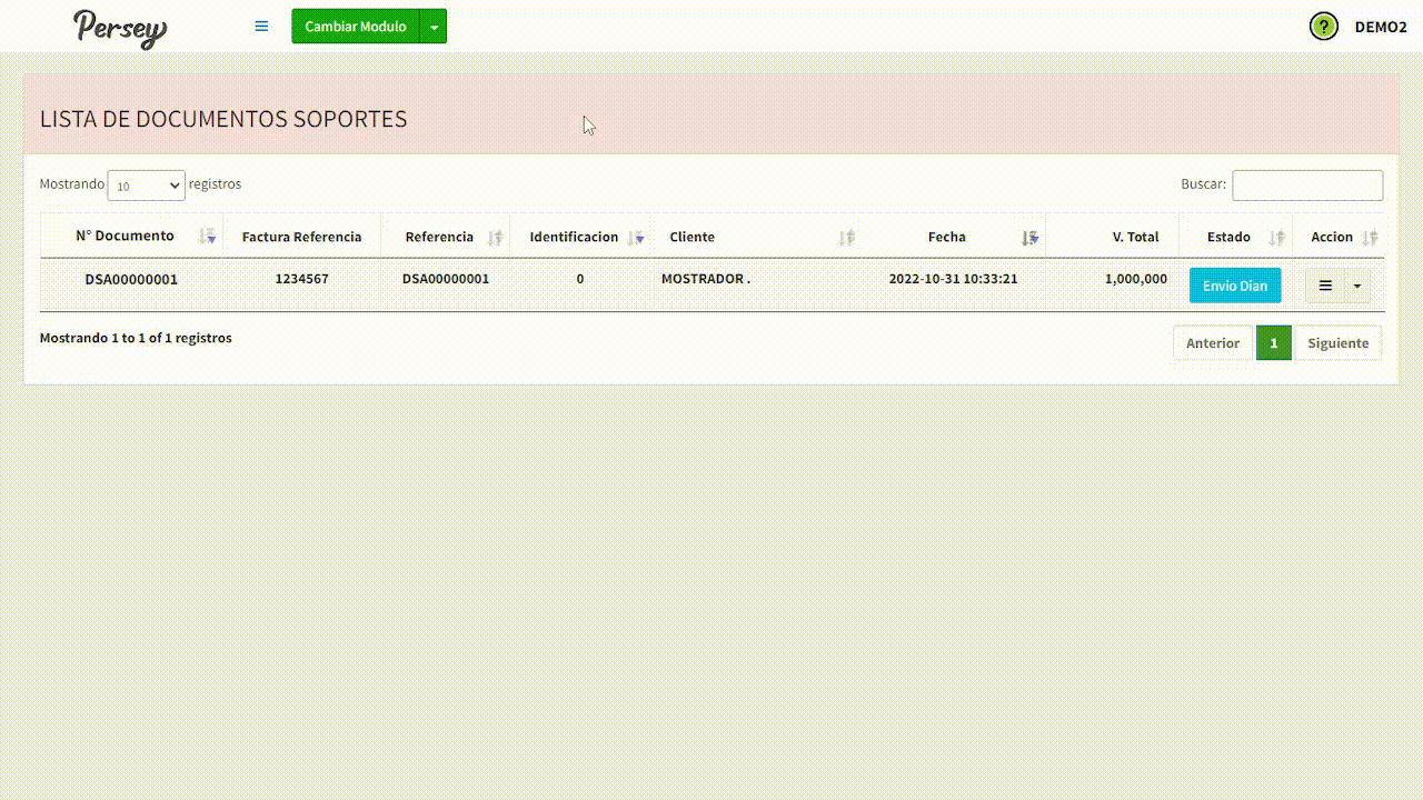Aqui podrá visualizar todos los documentos soporte y tambien enviarlos a la Dian desde el boton azul "ENVÍO DIAN"