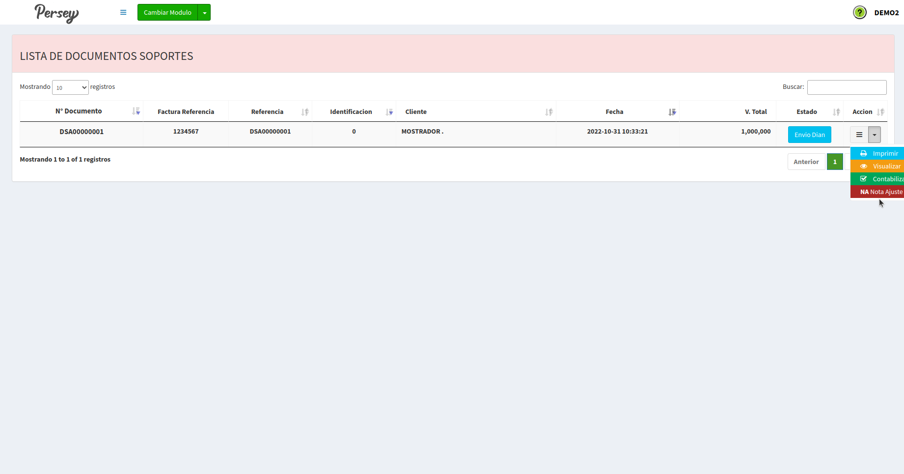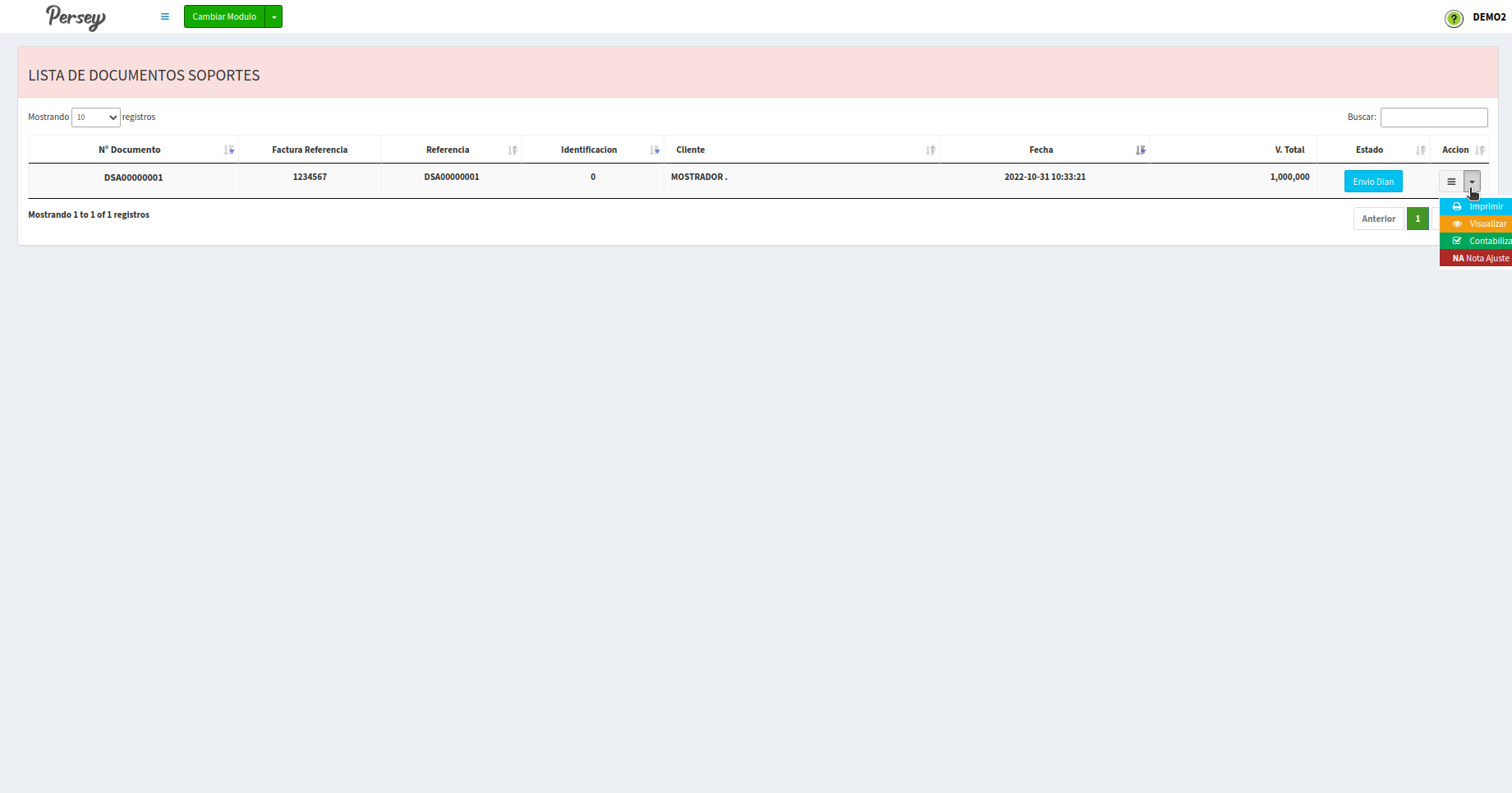 Tambien podrá observar las opciones por cada documento de soporte, usted podrá imprimir, contabilizar, visualizar o realizar una nota de ajuste