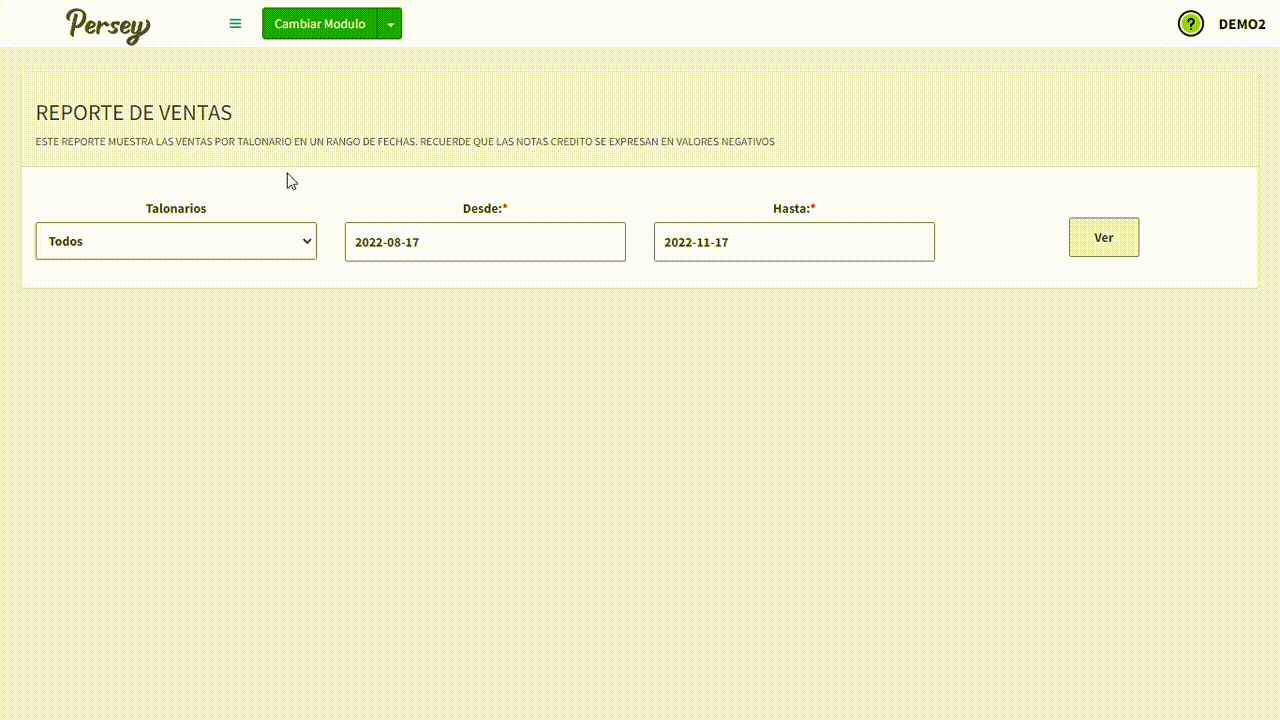 Para ver este reporte debe diligenciar el formulario , escoger el talonario, la fecha desde-hasta y darle click en el boton que dice "VER". Tambien puede descargarlo en PDF dandole click en el boton que dice "PDF"