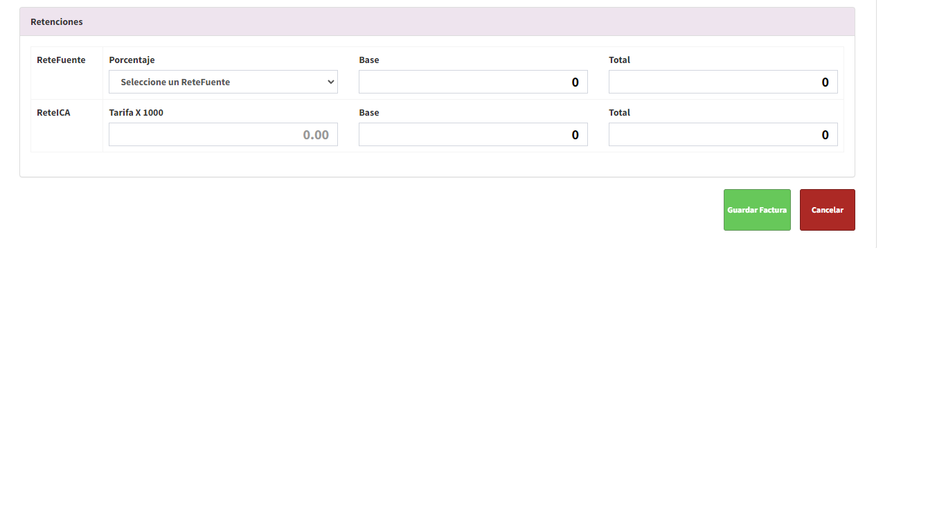 Si la empresa tiene activado las retenciones le aparecerá un formulario al final donde las puede diligenciar teniendo en cuenta campos como: "Porcentaje de ReteFuente", "Tarifa X 1000 para la ReteICa", sus respectivas bases y los totales. .