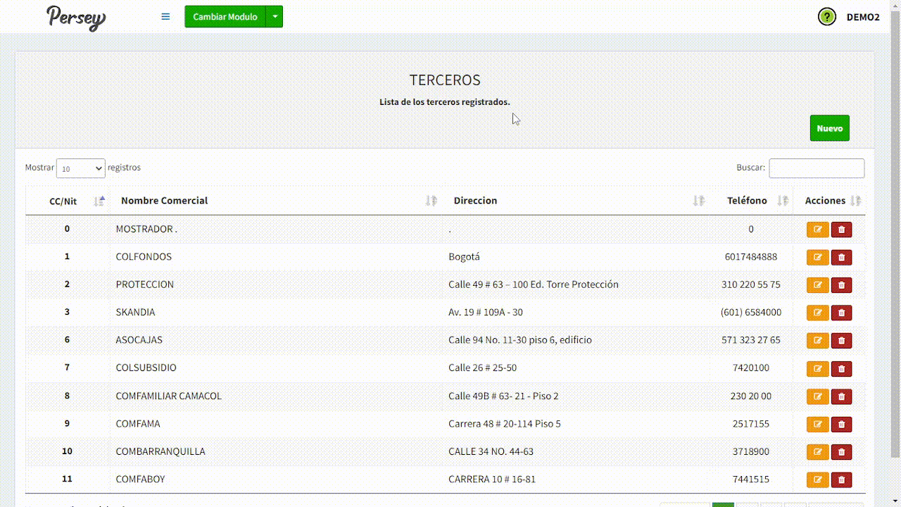 Le aparecerán todos los terceros que tenga en una lista, usted puede modificarlos dando click en el boton amarillo y crear uno nuevo dando click en el boton que dice NUEVO