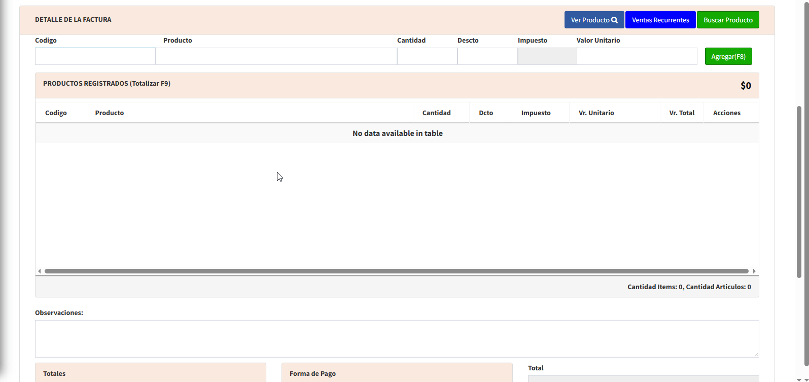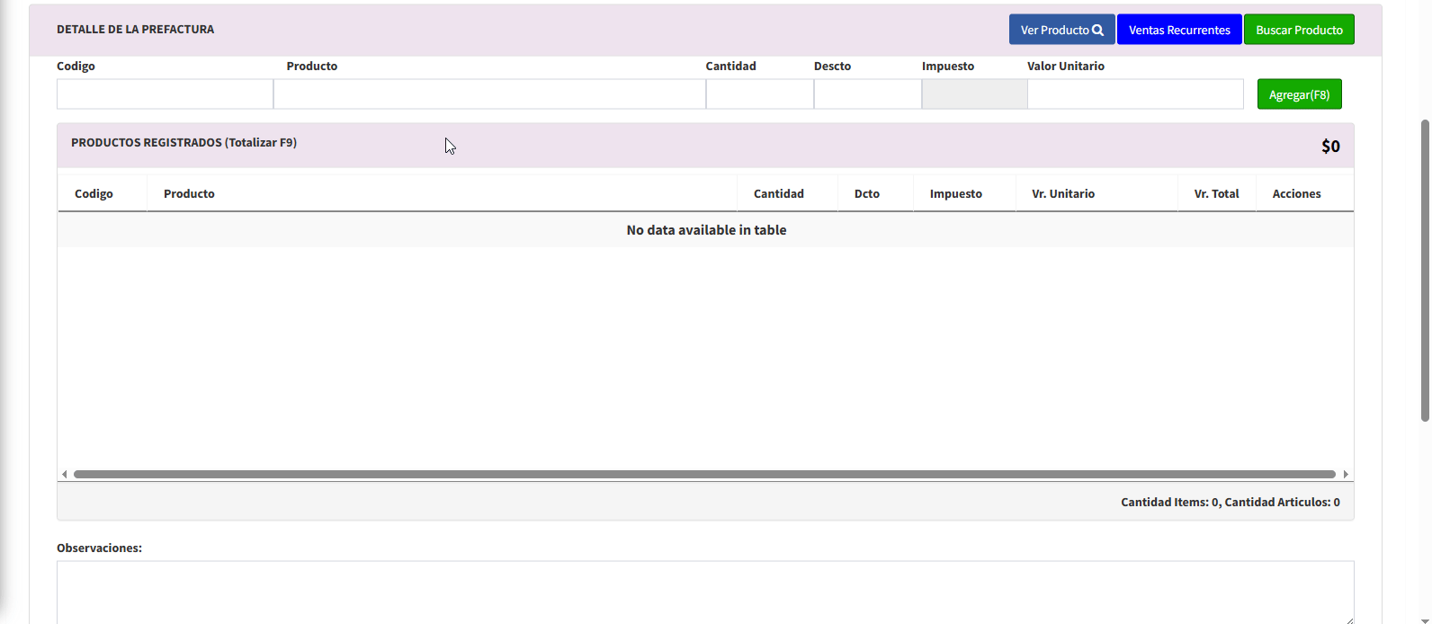 Nota: Es importante verificar los valores de las cantidades, descuentos y precios de los prouctos para proceder a guardarEn caso de no tener prefactura, se deben llenar todos los campos correspondientes teniendo en cuenta los siguientes pasos:
