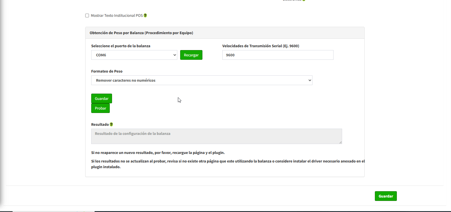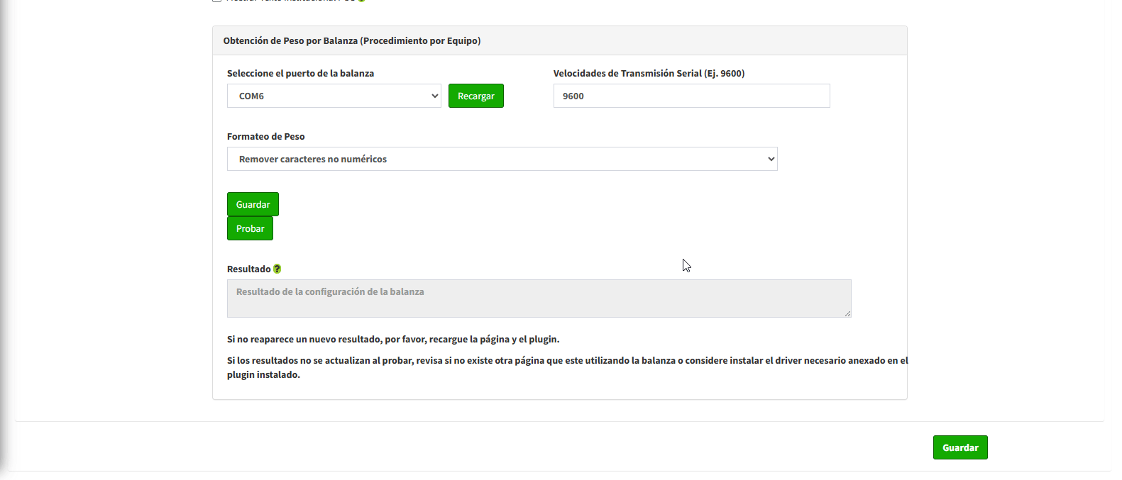 Se configura el puerto donde se está escuchando la balanza (se verifica en panel administrador de dispositivos), se establece una velocidad de transmisión serial (por defecto es 9600), y en Formateo de peso se configura en Remover caracteres no numéricos para poder usar la balanza en los procesos de facturación.