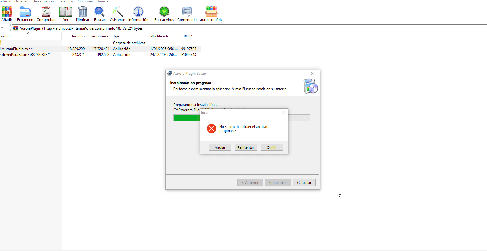 Si aparece un error al instalar, es porque el plugin de Aurora ya se encontraba instalado y siendo ejecutado, en este caso debemos cerrarlo desde iconos ocultos y continuar con la instalación.