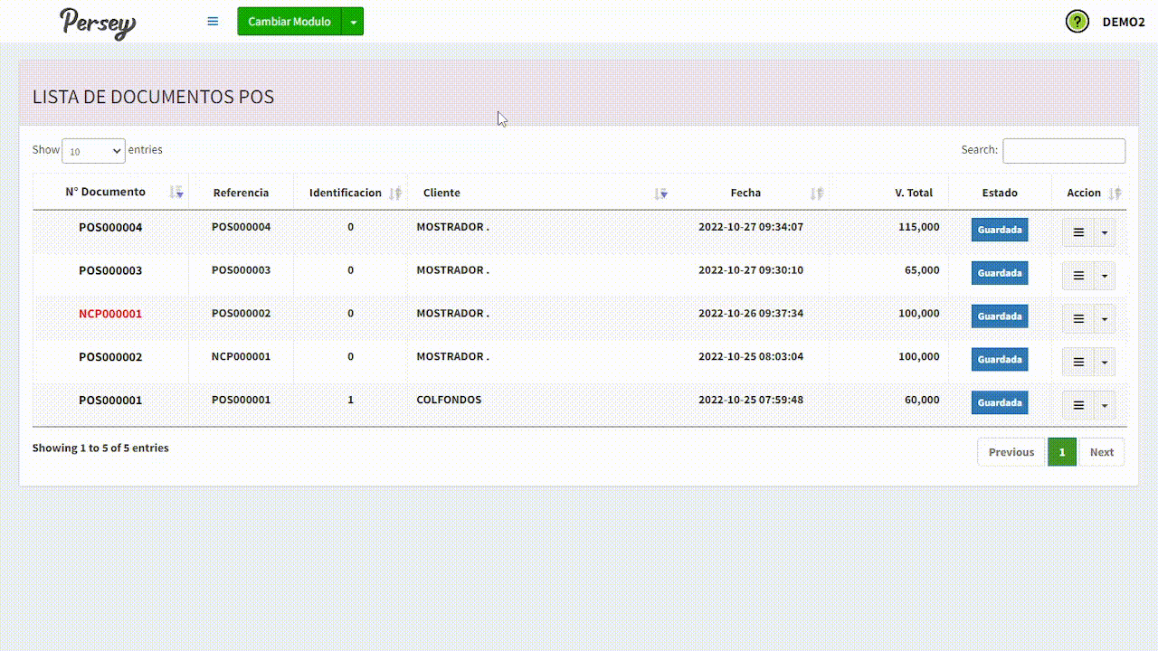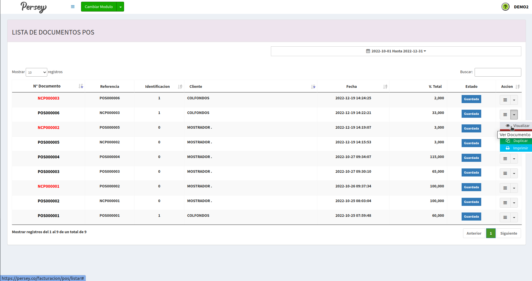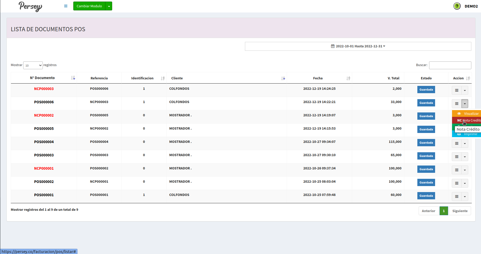 En esta sección podrá visualizar todas las facturas creadas, hacer una nota credito , duplicar la factura y imprimir la factura desde una impresora POS