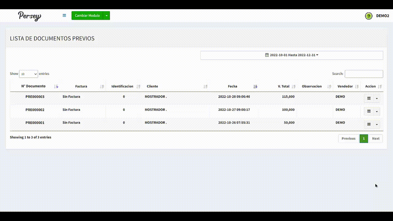 Aqui apareceran todos los previos o prefacturas que haya generado y sus respectivas opciones