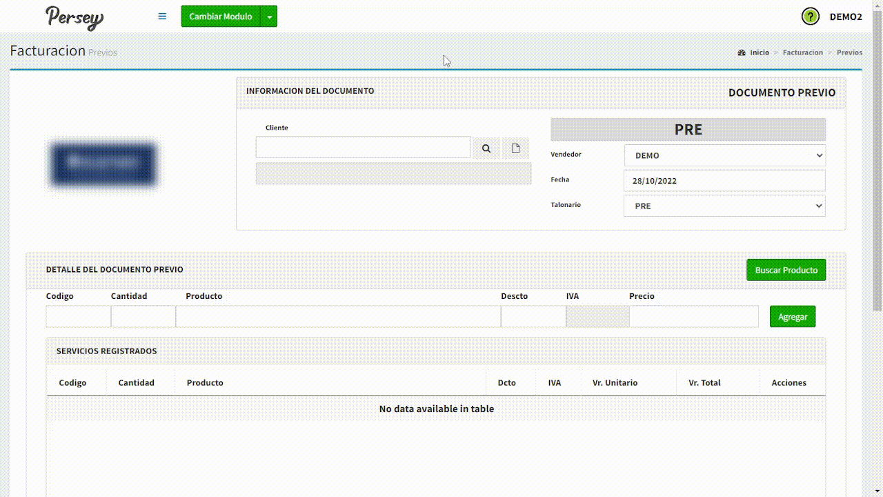 Para crear un nuevo previo se debe escoger o crear el cliente(tercero). Buscar los productos que desea añadir a su prefactura y darle guardar