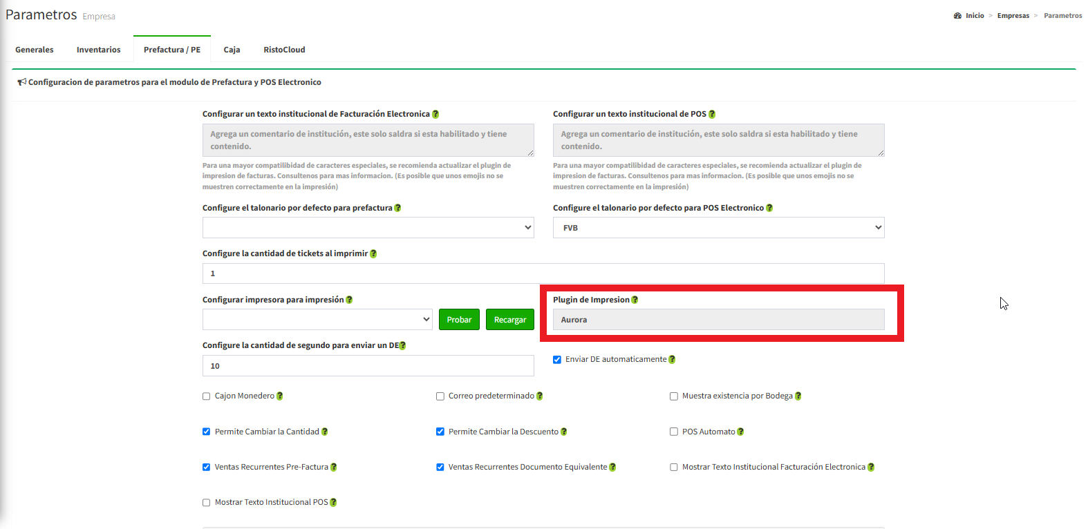 En el módulo de administración de Persey, en el menú de Catalogos-Parametros, verificamos que Aurora este siendo utilizado como plugin de reconocimiento de dispositivos en la pestaña Prefactura/PE.