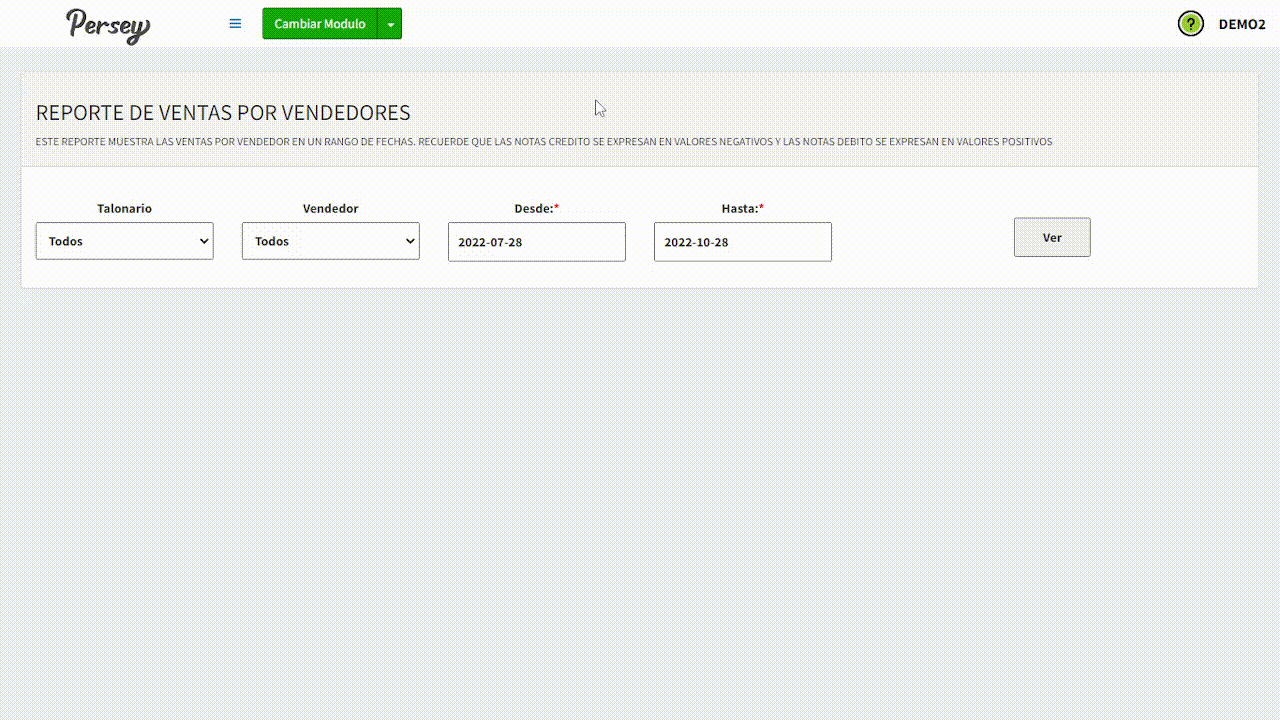 Para ver este reporte debe diligenciar el formulario , escoger el talonario, el vendedor, la fecha desde-hasta y si quiere un reporte detallado o resumido, luego darle click en el boton que dice "VER". Tambien puede descargarlo en PDF dandole click en el boton que dice "PDF"