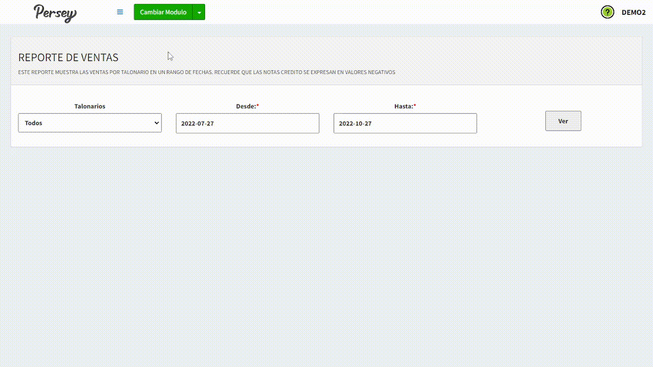 Para poder ver este reporte, se debe diligenciar el formulario, escoger el talonario, la fecha desde-hasta y darle click en el boton que dice "VER". Tambien se puede descargar en PDF dandole click en el boton que dice "PDF".