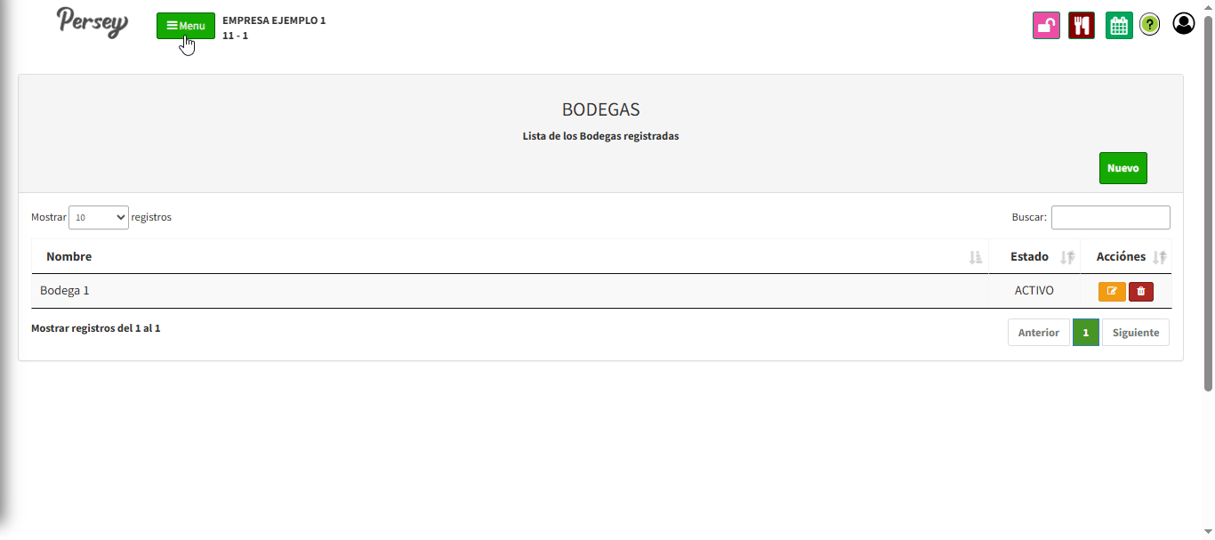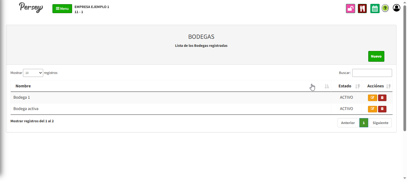 Para agregar una nueva Bodega debe darle en el boton que dice "NUEVO". Debe diligenciar el nombre de la bodega, el estado Y darle click en el boton que dice "GUARDAR"