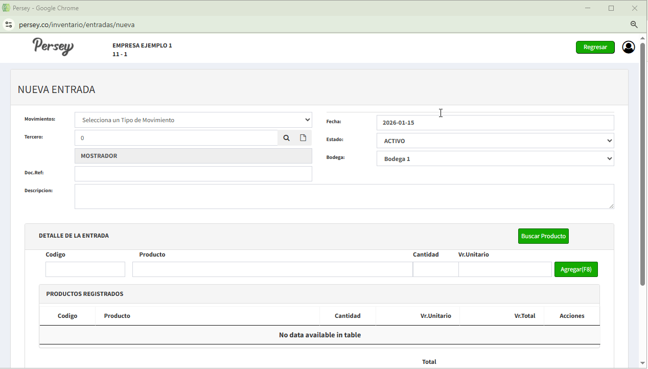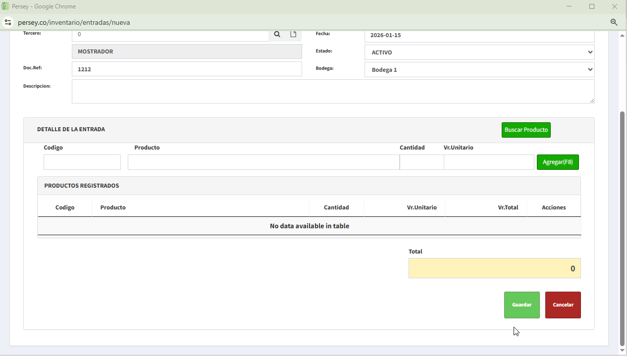 Ahora deberá agregar los productos a la entrada que va a generar, debe darle click en el boton que dice buscar producto, selecciona el producto con el boton amarillo, debe poner la cantidad y el valor unitario luego darle en el boton agregar