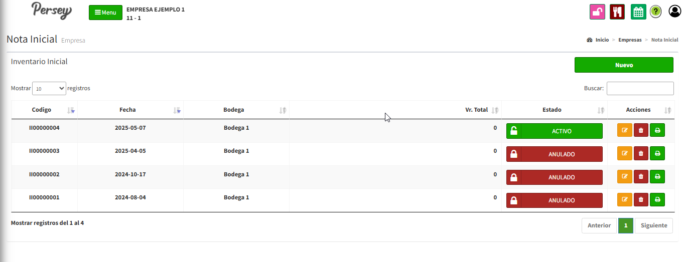 Si desea imprimir o descargar un documento tipo factura de su inventario inicial debe darle click en el boton verde que aparece a la derecha del inventario que agregó
