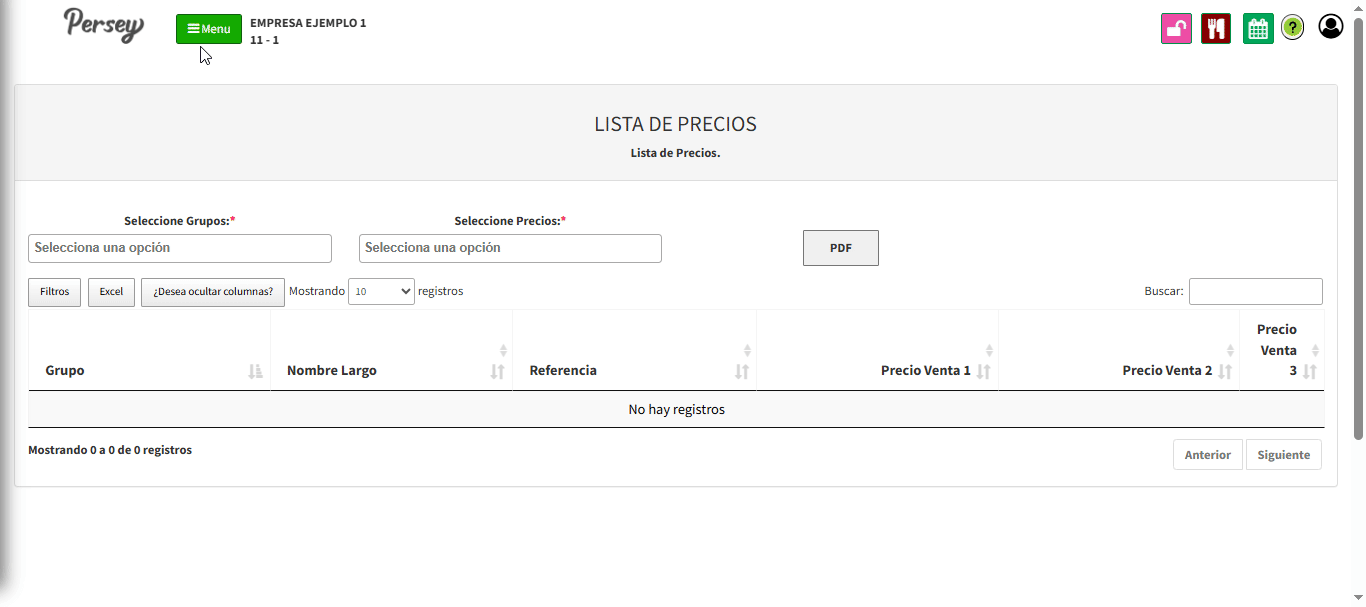Aca podemos ver la lista de precios dividos en grupos, podemos seleccionar uno o más, ademas de ver los precios de venta 1, 2 o 3. Esto genererá un pdf con el reporte listo para imprimir o visualizalo.