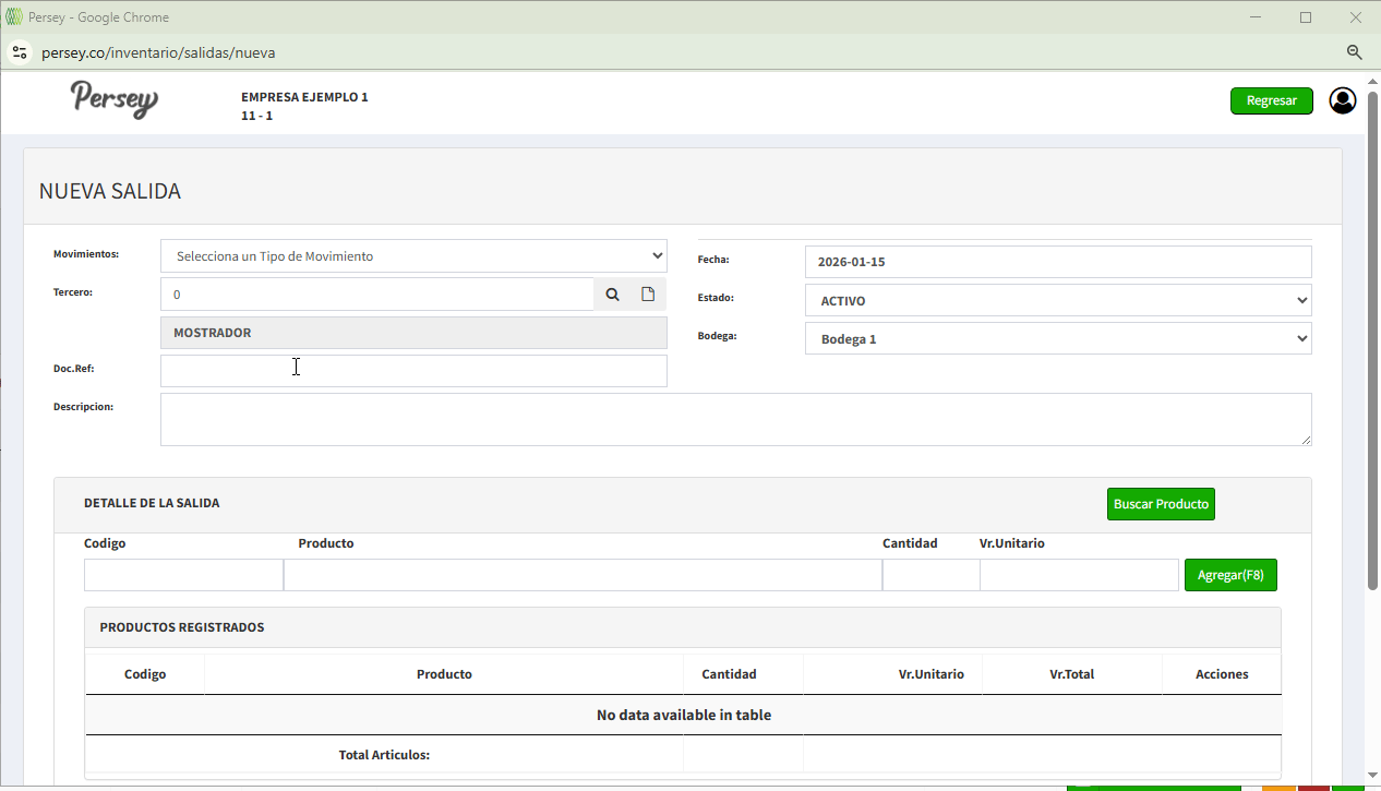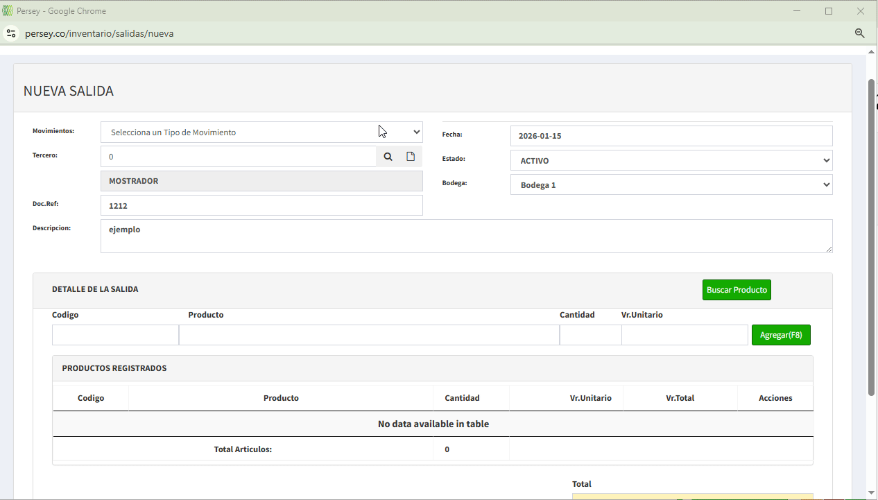 Ahora deberá agregar los productos a la salida que va a generar, debe darle click en el boton que dice buscar producto, selecciona el producto con el boton amarillo, debe poner la cantidad y el valor unitario, darle en el boton agregar y por ultimo en guardar
