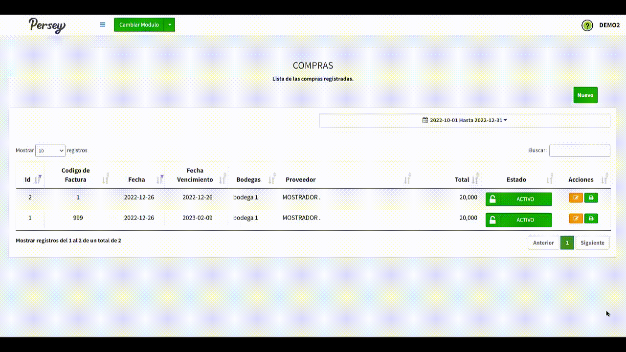 Dirijase hacia la sección de "Reportes" y elija la opción de "Compras por Periodo". elija las fechas sobre las cuales quiere usted ver el reporte y posterior a ello oprima en "Ver"